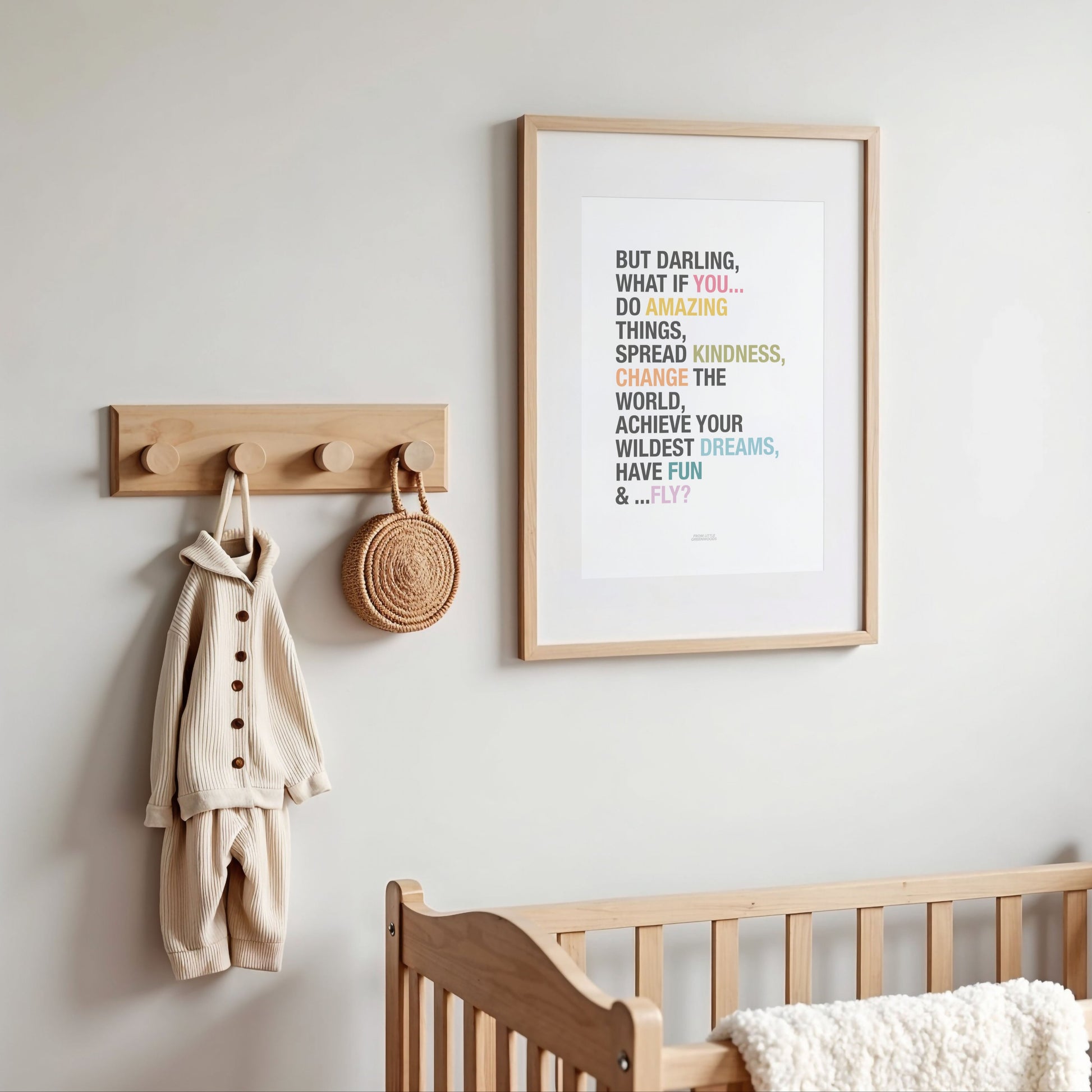 This uplifting and empowering word art print featuring a playful take on the phrase ‘But what if you fly,’ is perfect for inspiring young girls and women of all age to follow their dreams, giving them the courage and confidence to believe in themselves and that anything is possible.