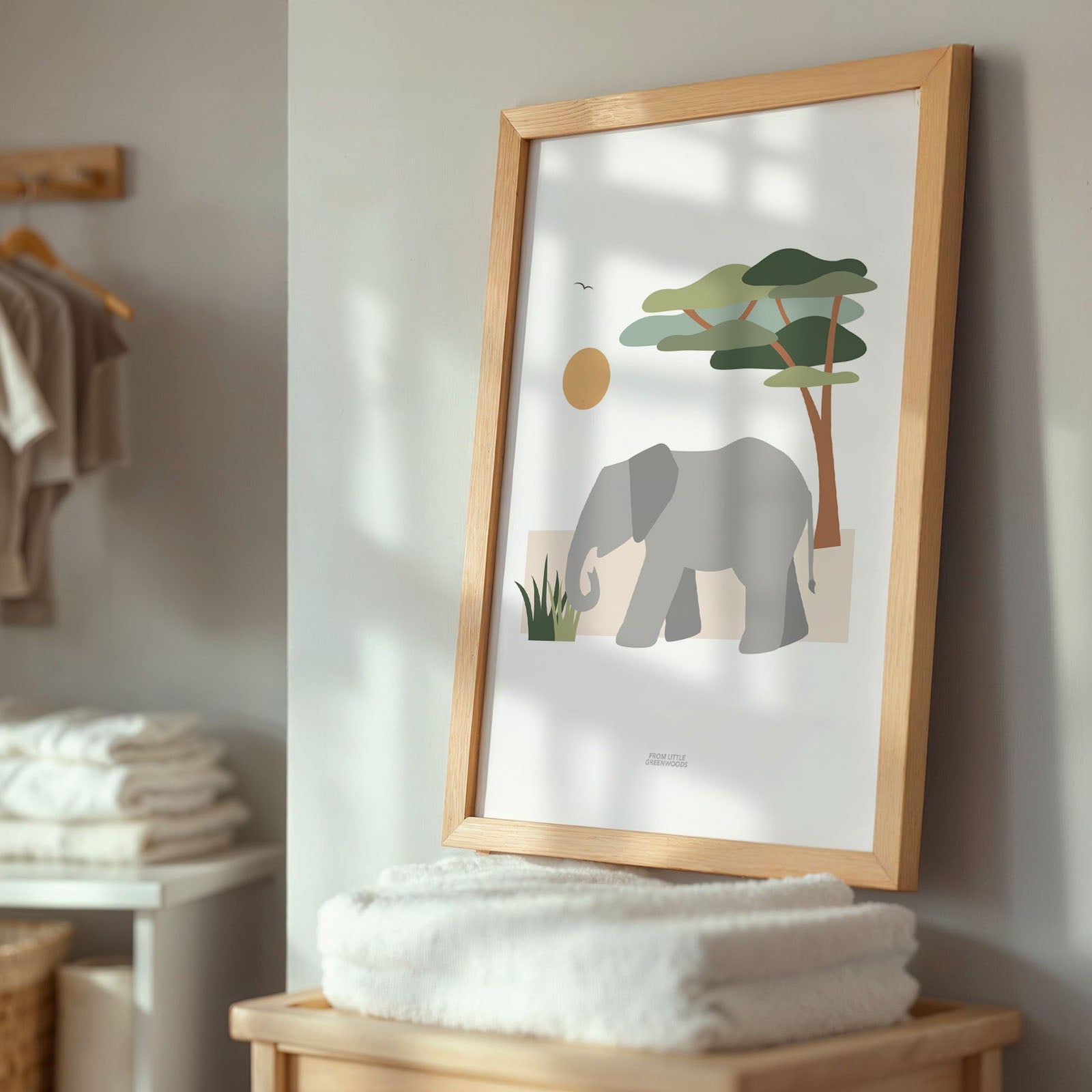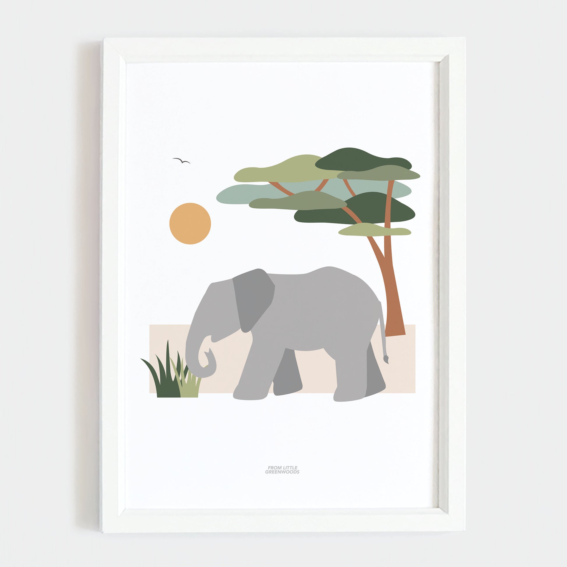 This charming elephant illustration set in a colourful savanna is the perfect decor for a newborn's safari themed nursery or child's jungle bedroom.