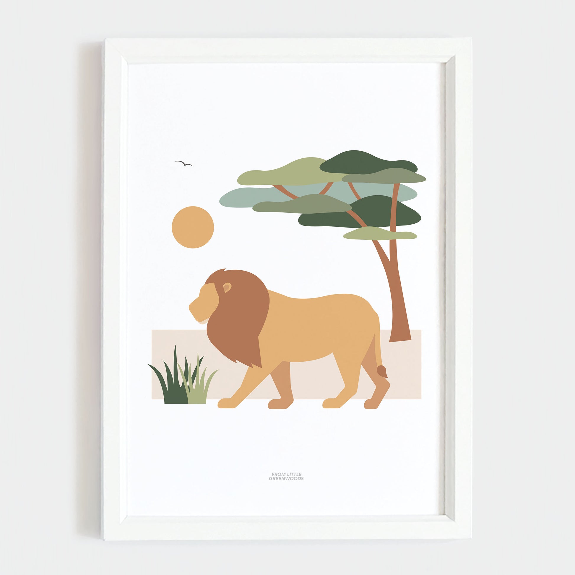 This charming lion illustration set in a colourful savanna is the perfect decor for a newborn's safari themed nursery or child's jungle bedroom.