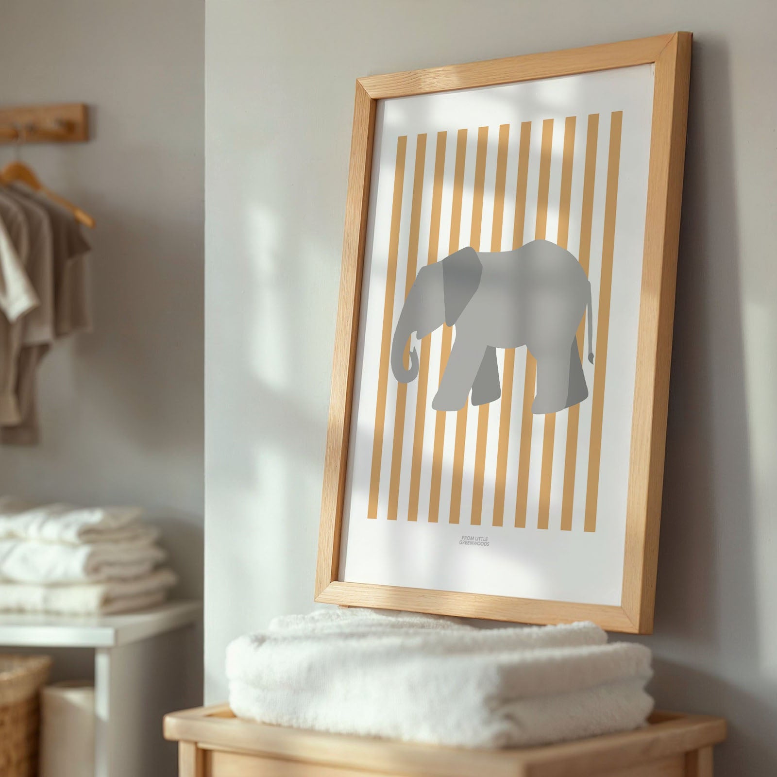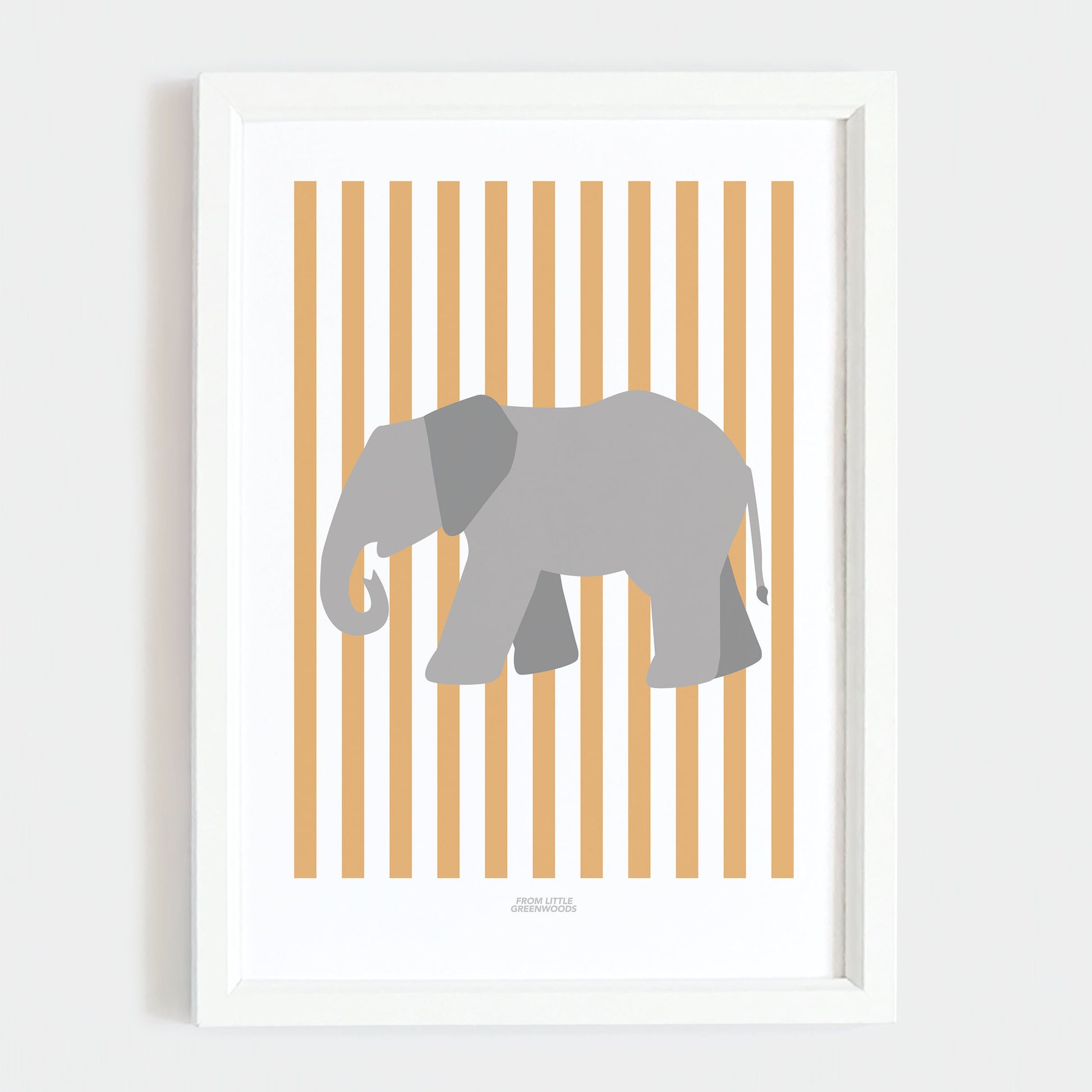This charming elephant illustration on a mustard yellow striped background is the perfect decor for a newborn's safari themed nursery or child's jungle bedroom.