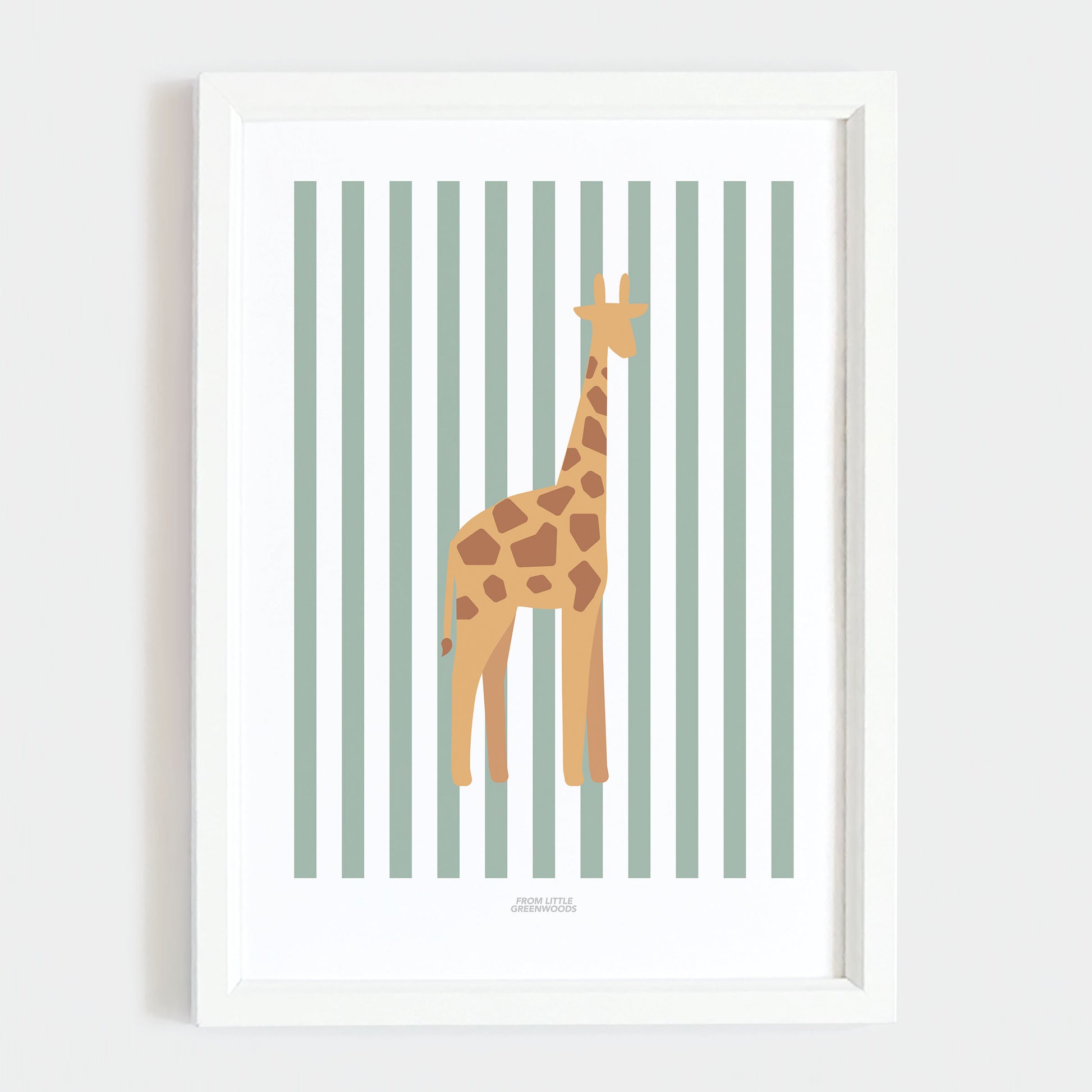 This charming giraffe illustration on a teal striped background is the perfect decor for a newborn's safari themed nursery or child's jungle bedroom.