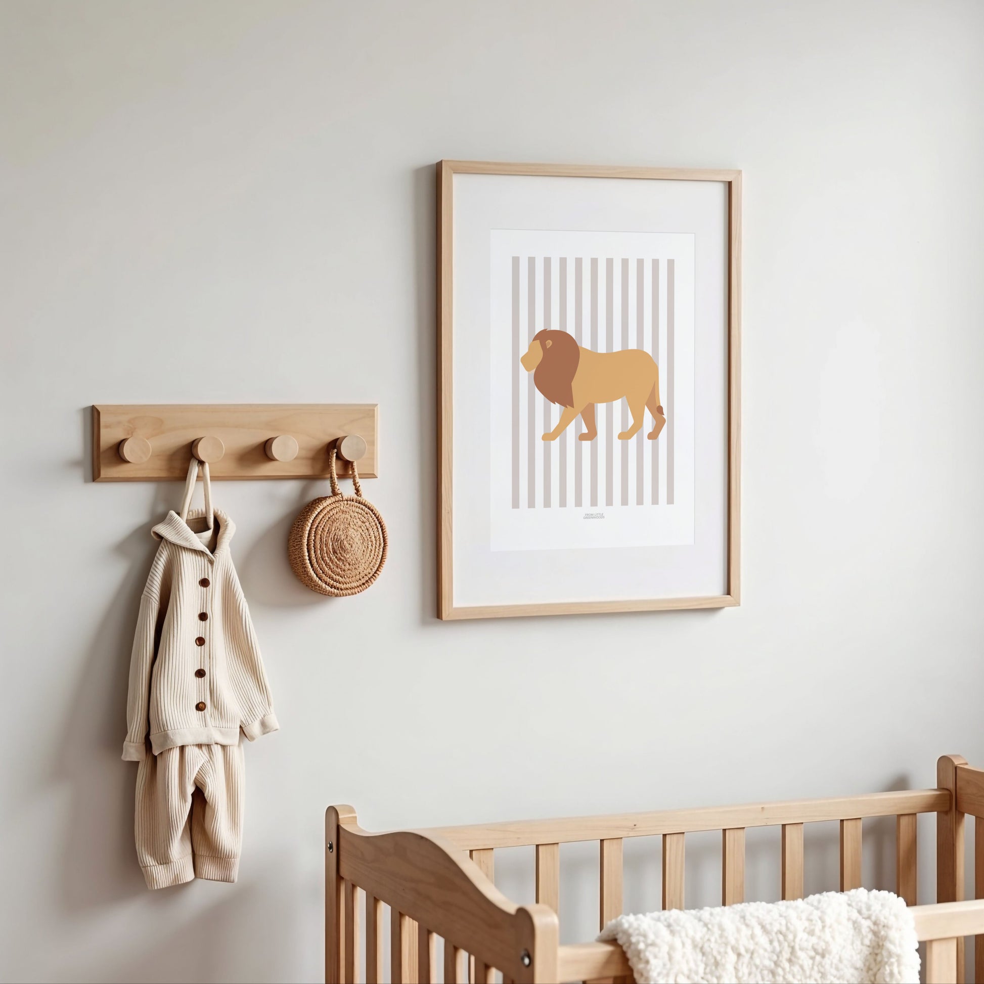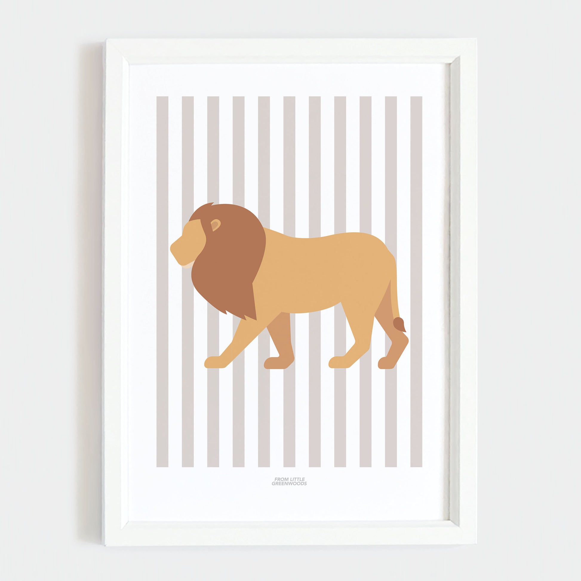 This charming lion illustration on a warm grey stripe background is the perfect decor for a newborn's safari themed nursery or child's jungle bedroom.