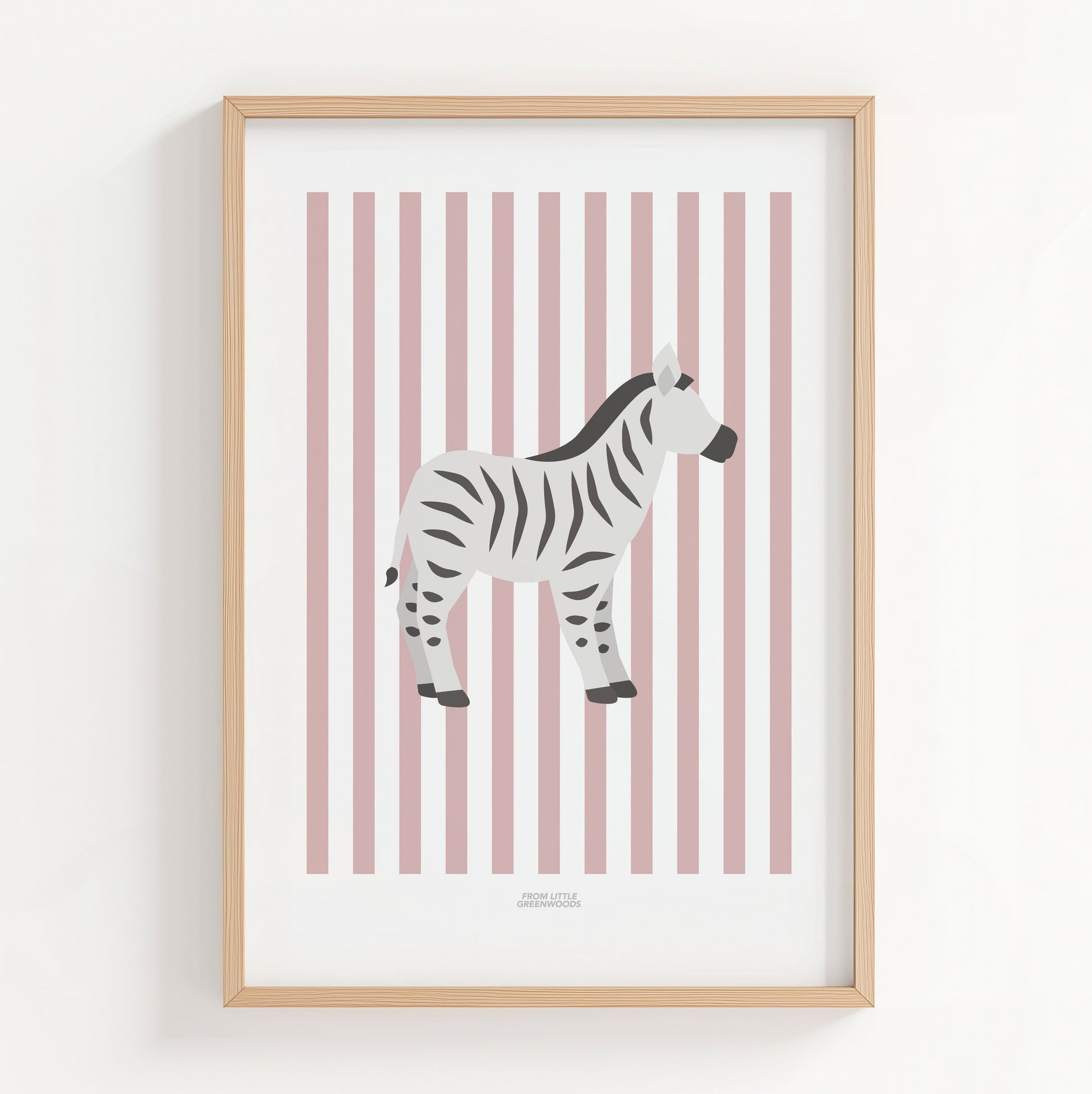 This charming zebra illustration on a dusky pink striped background is the perfect decor for a newborn's safari themed nursery or girl's jungle bedroom.