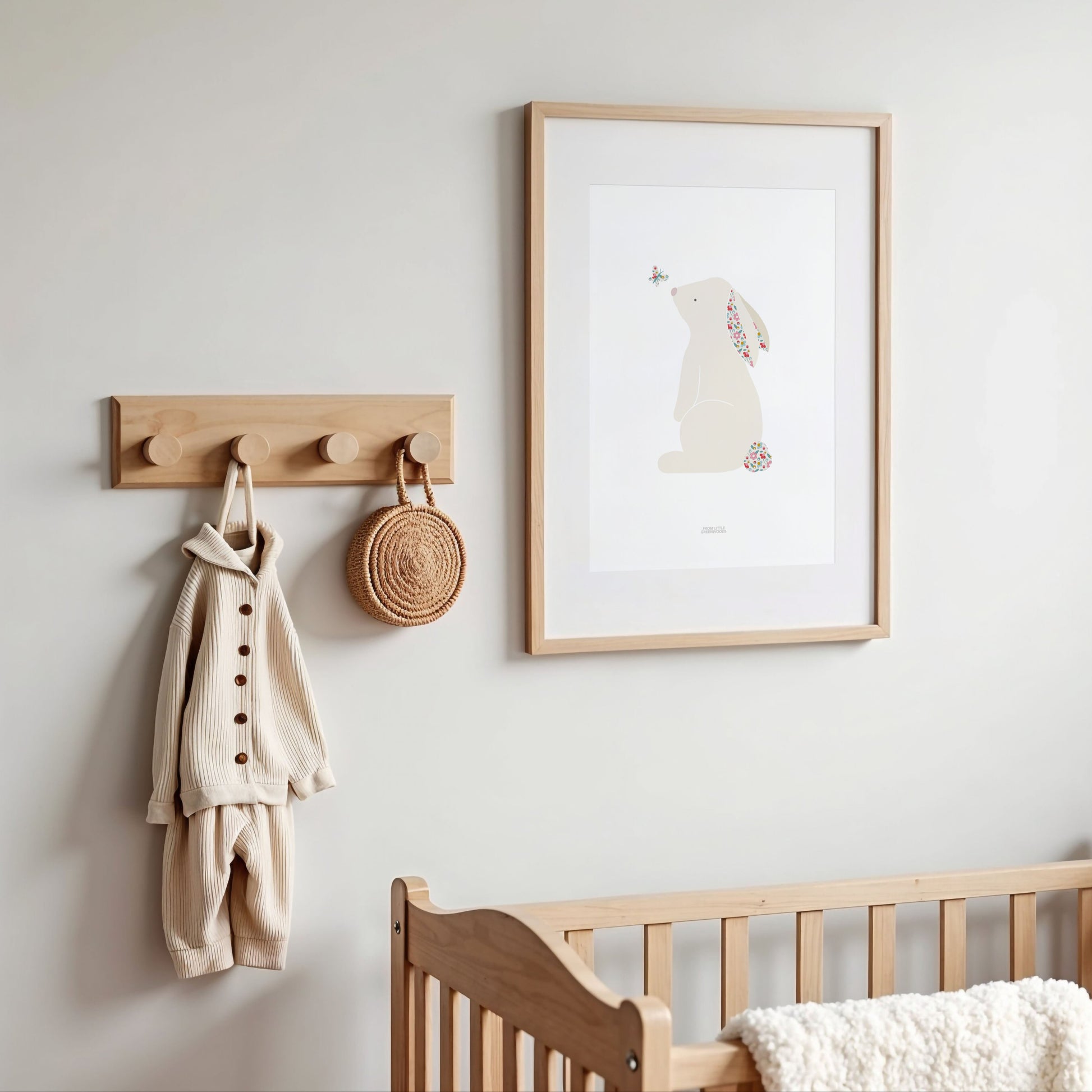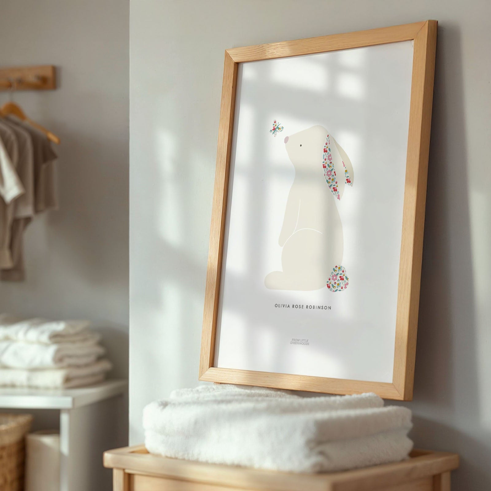 This whimsical bunny rabbit illustration wall art with accents of pink ditsy floral patterned ears and cottontail, is designed in delicate pastel colours inspired by the beauty found in nature and specifically in an English country garden.
