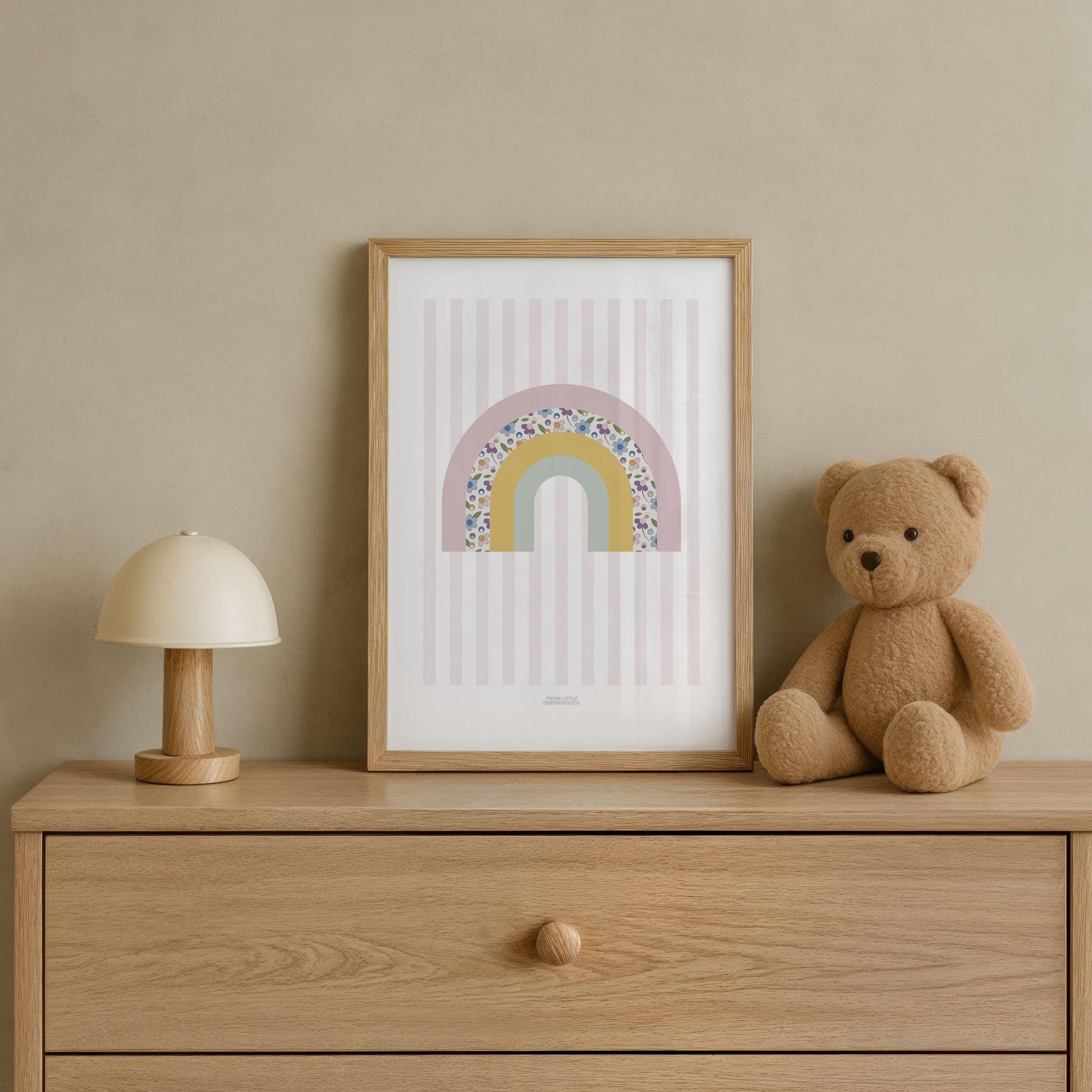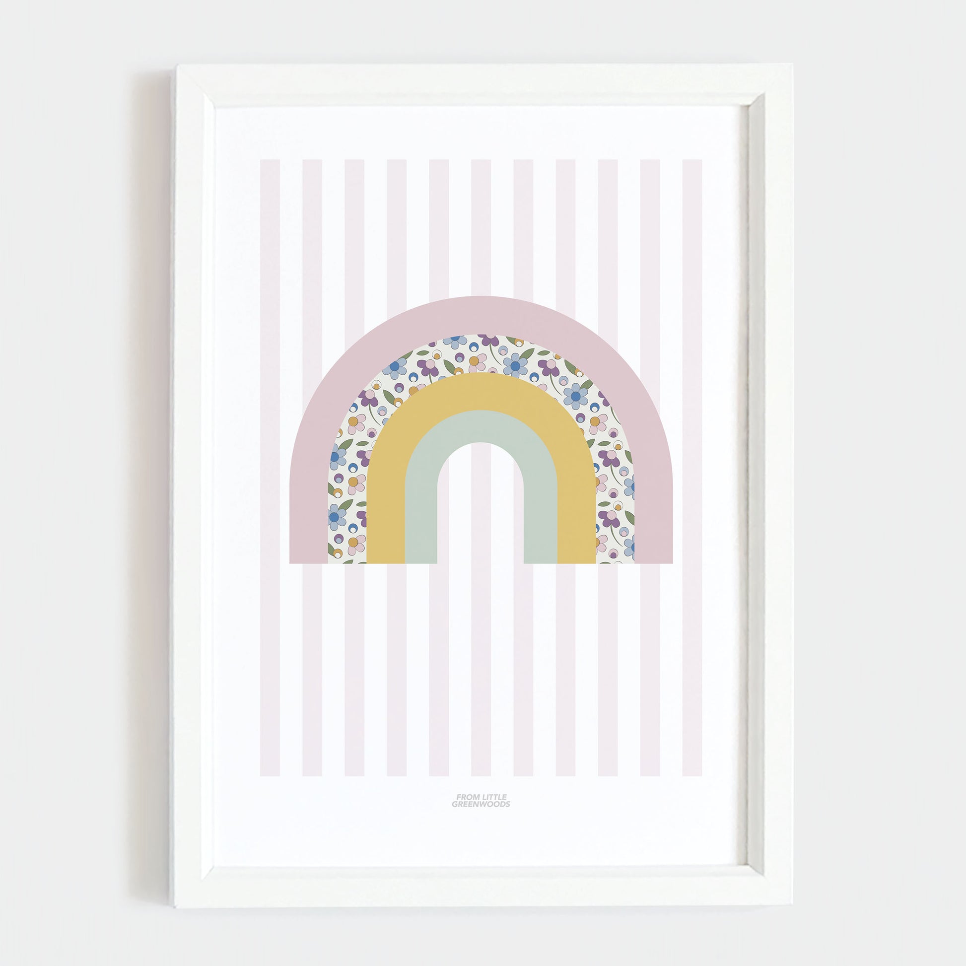This pretty rainbow illustration on a pale pink striped background is the perfect decor for a newborn girl's nursery or princess themed bedroom.