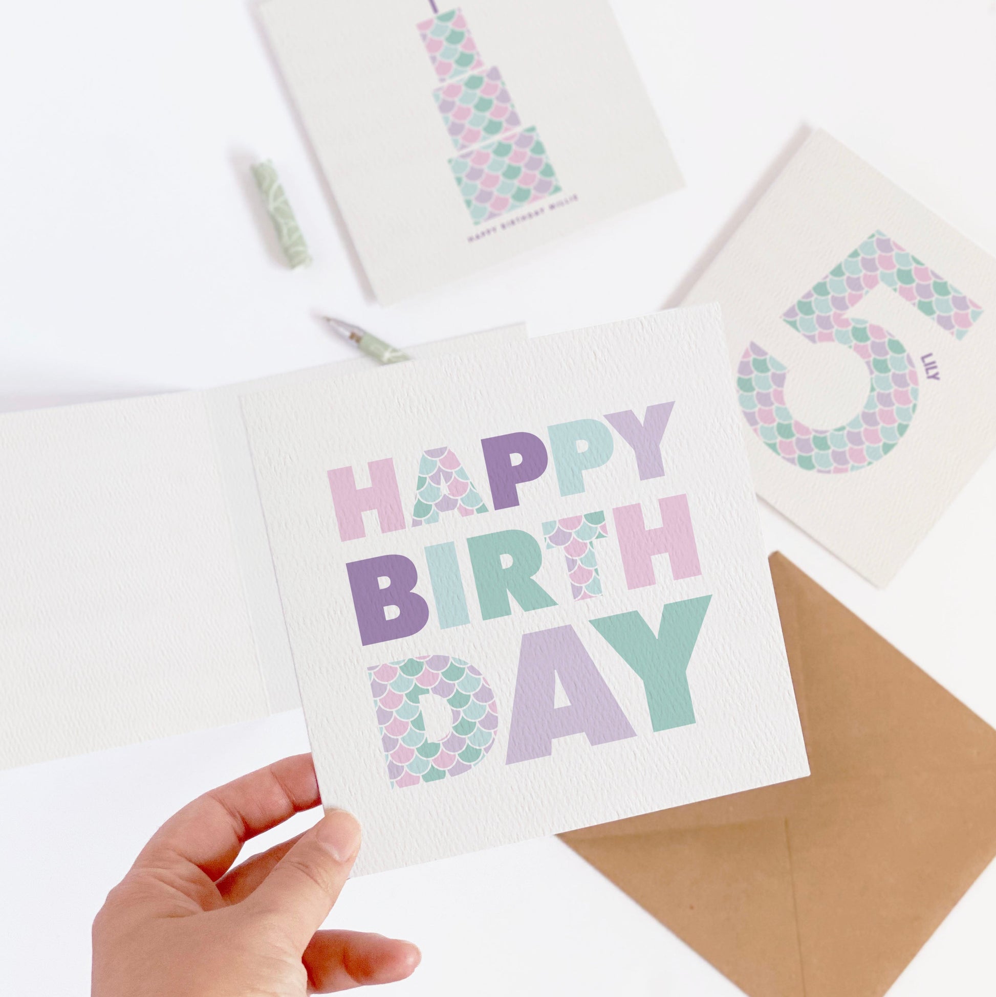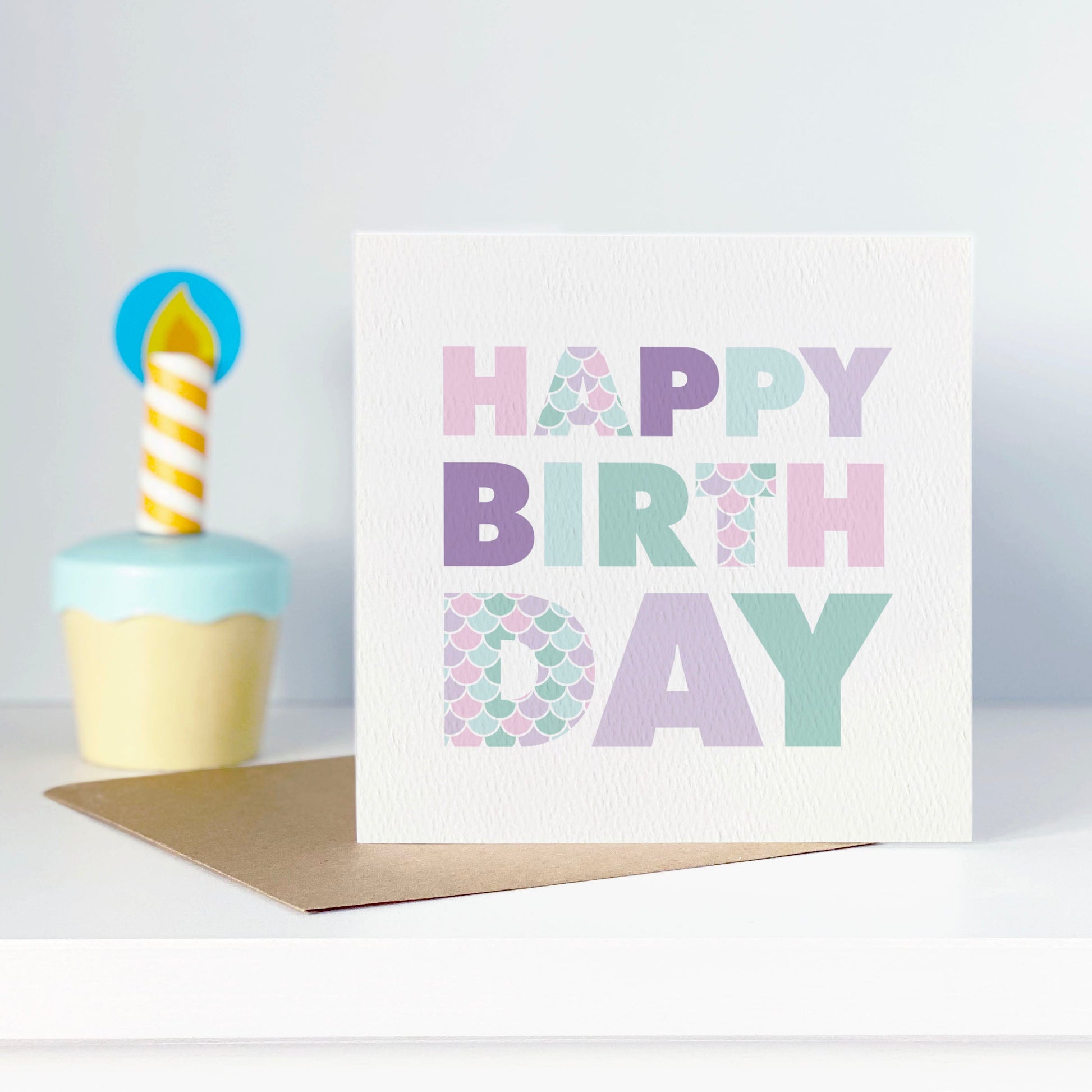 Wish them a Happy Birthday on their big day with this cute kid's card in pretty pastel pinks, greens and purples.