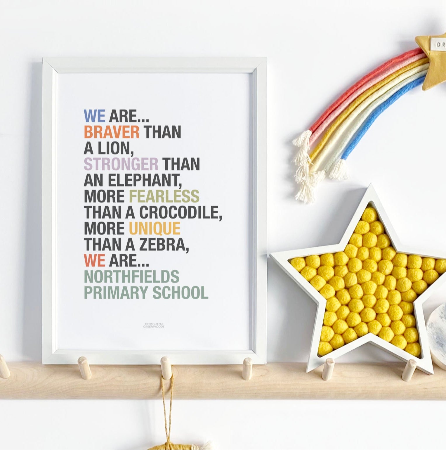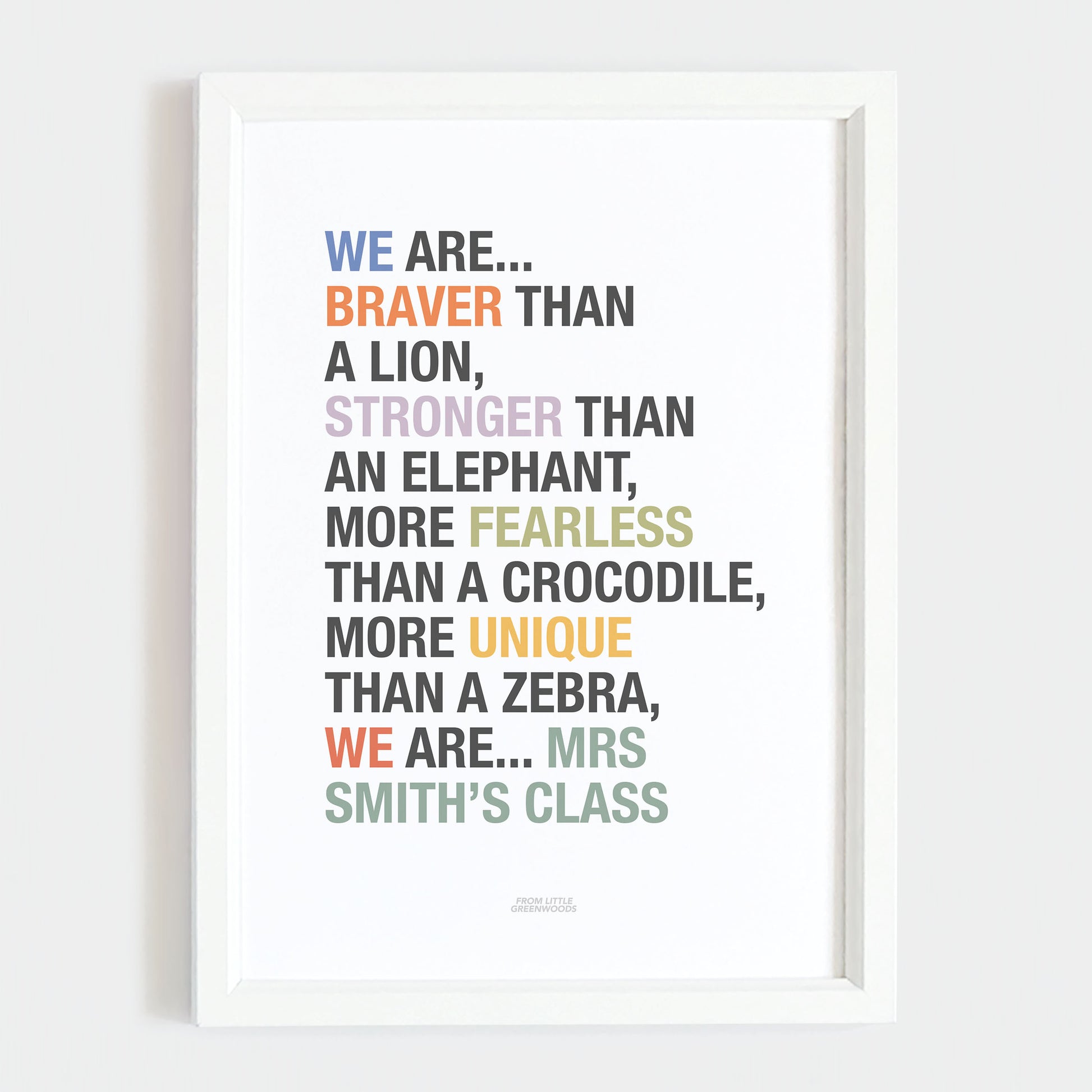 Maybe you're a teacher that wants to brighten up their classroom with a motivational quote, or you're a parent looking for a unique and personalised thank you gift for those that have taught and cared for your child, then this modern typographic wall art with a safari animal twist is sure to be a hit.