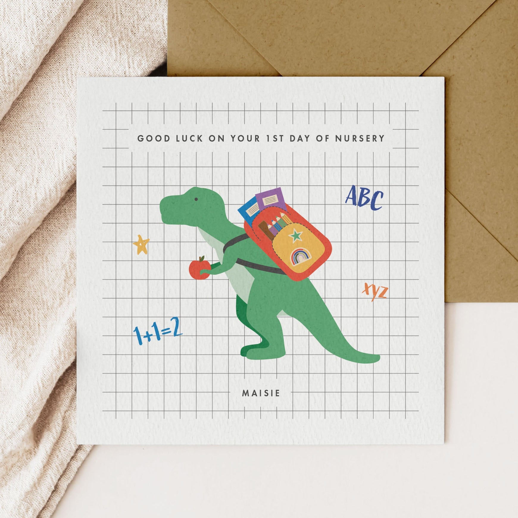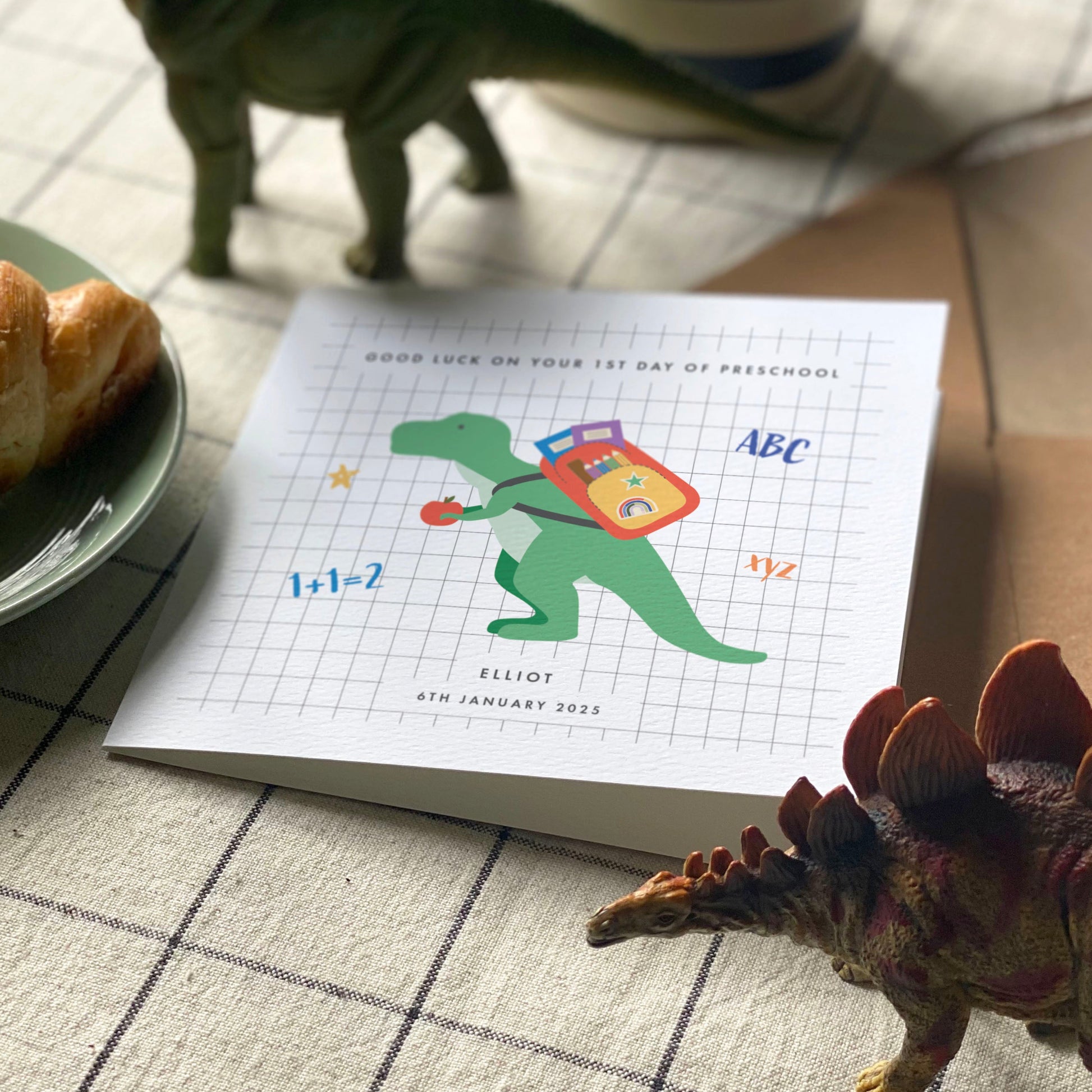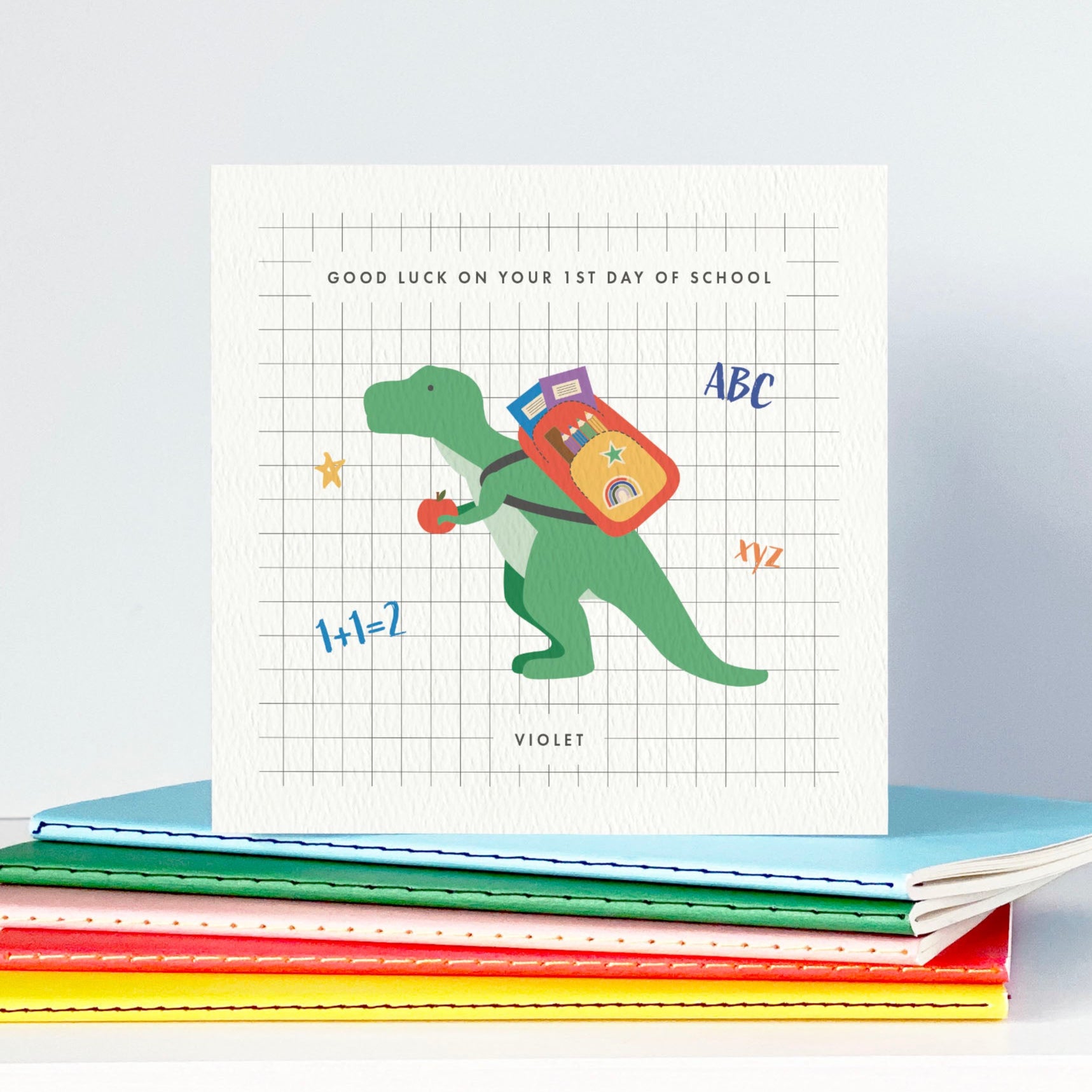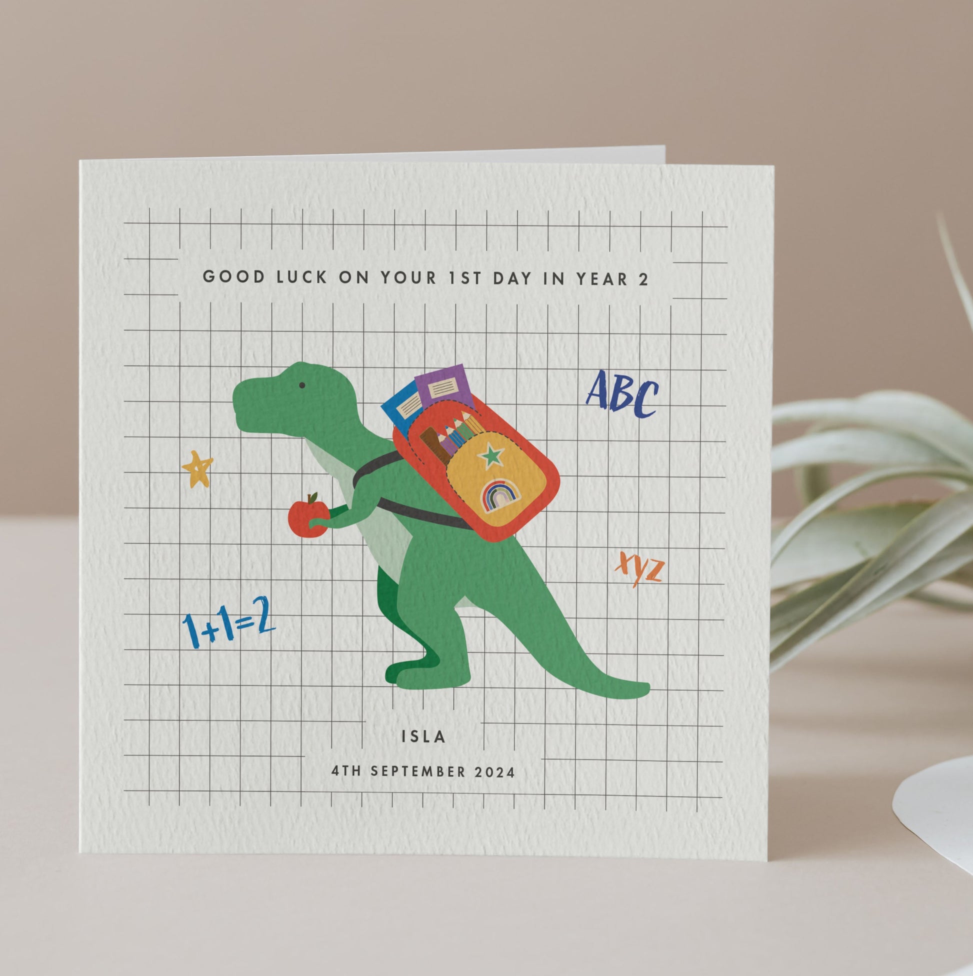 Celebrate your child's next exciting milestone with this fun Dinosaur themed Personalised First Day at School Greetings Card, perfect for capturing and commemorating the start of their educational journey. Ideal for little dino fans starting school, nursery, preschool or secondary school, as well as those starting a new school and going back to school into a new year.