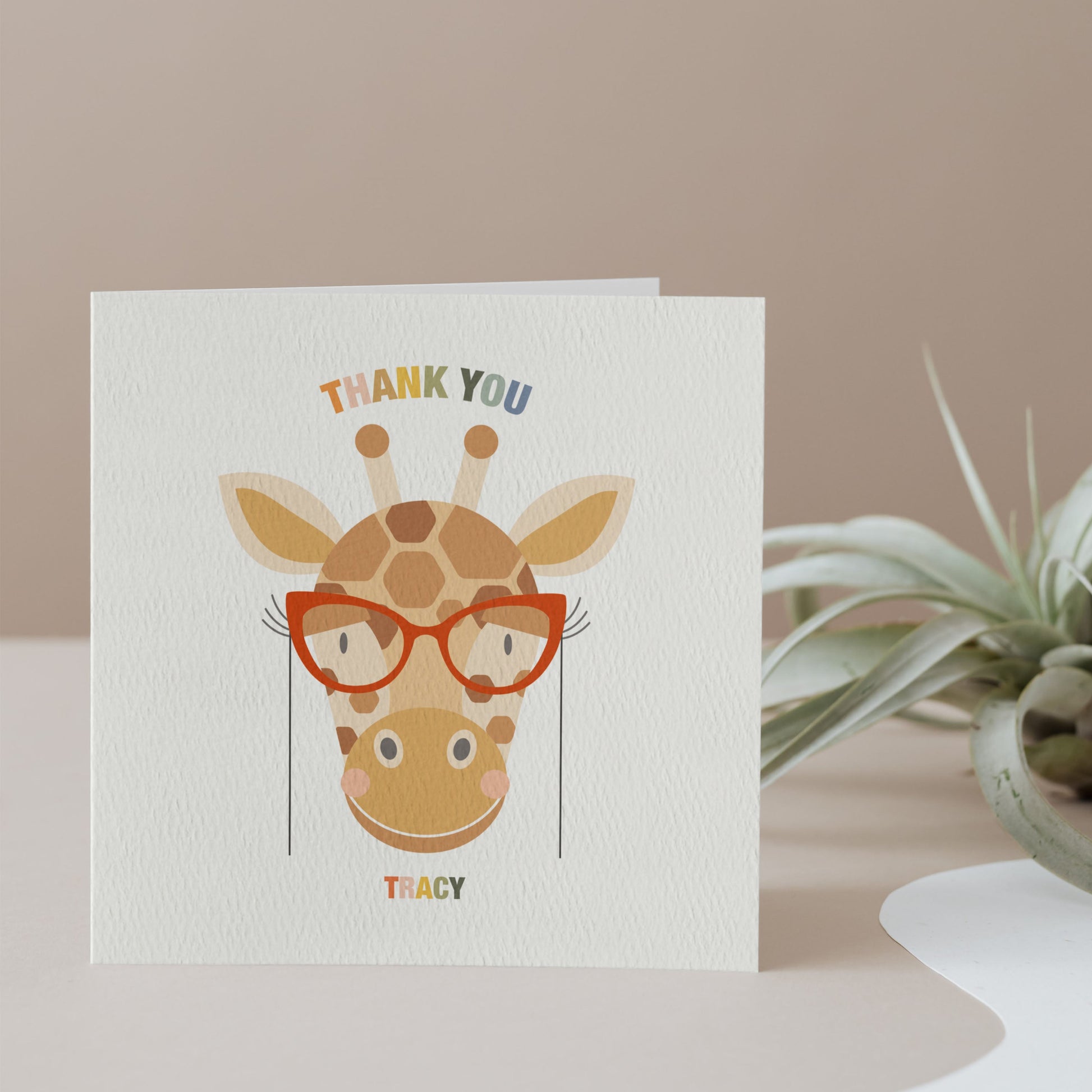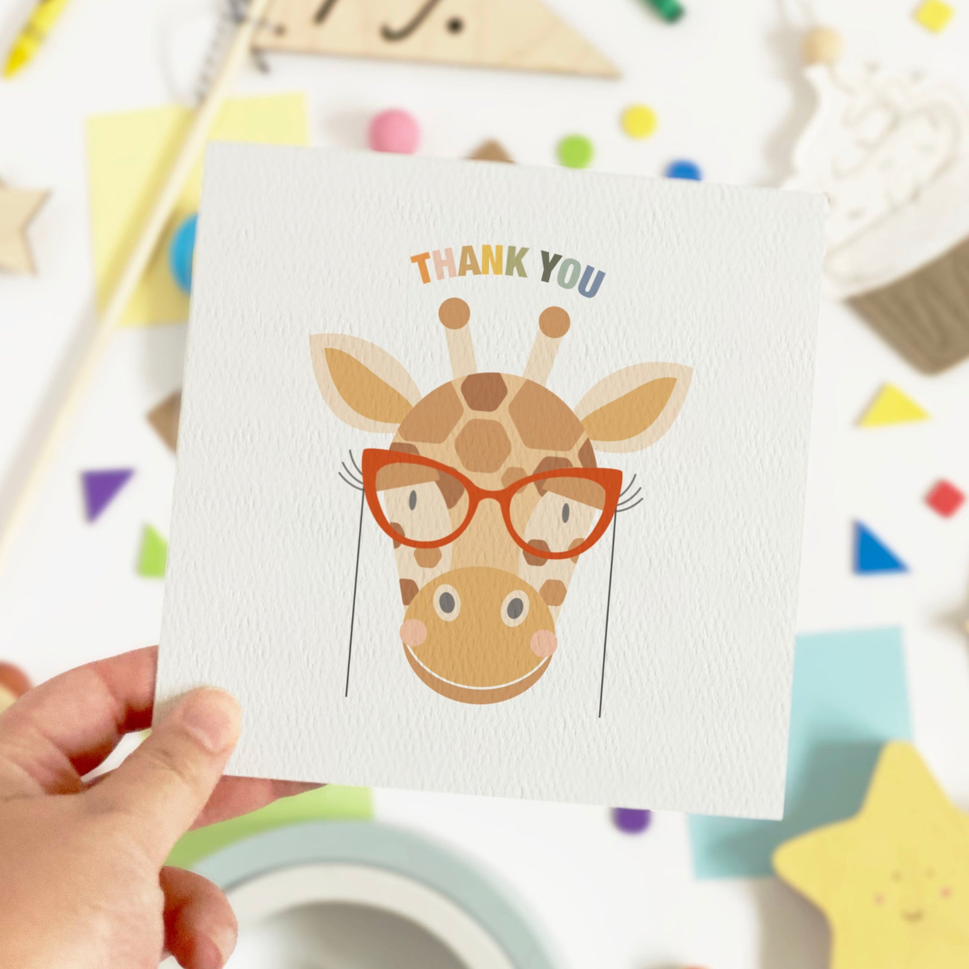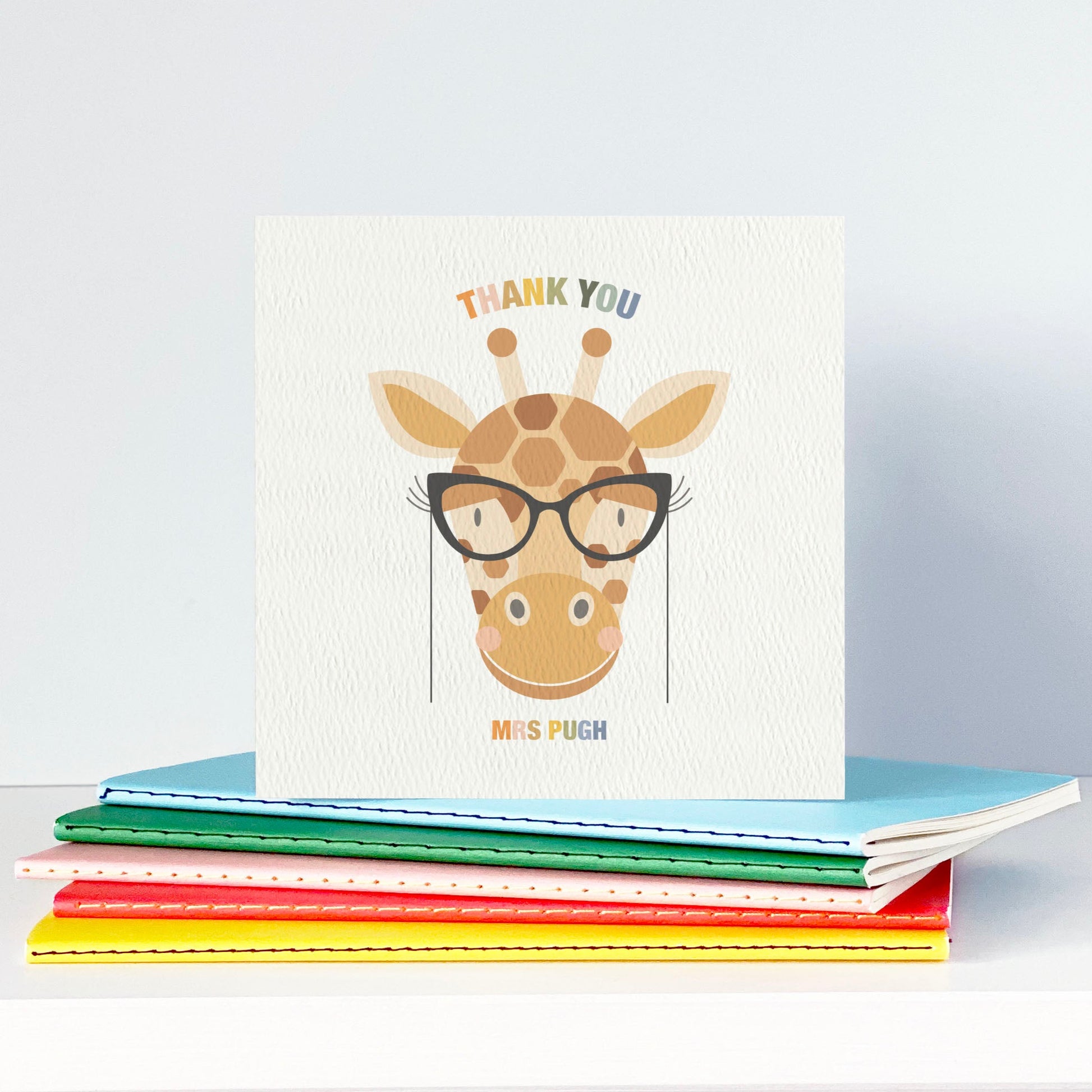 Show your appreciation for your favourite teachers or nursery staff with this delightful Thank You card featuring an adorable giraffe wearing glasses!
