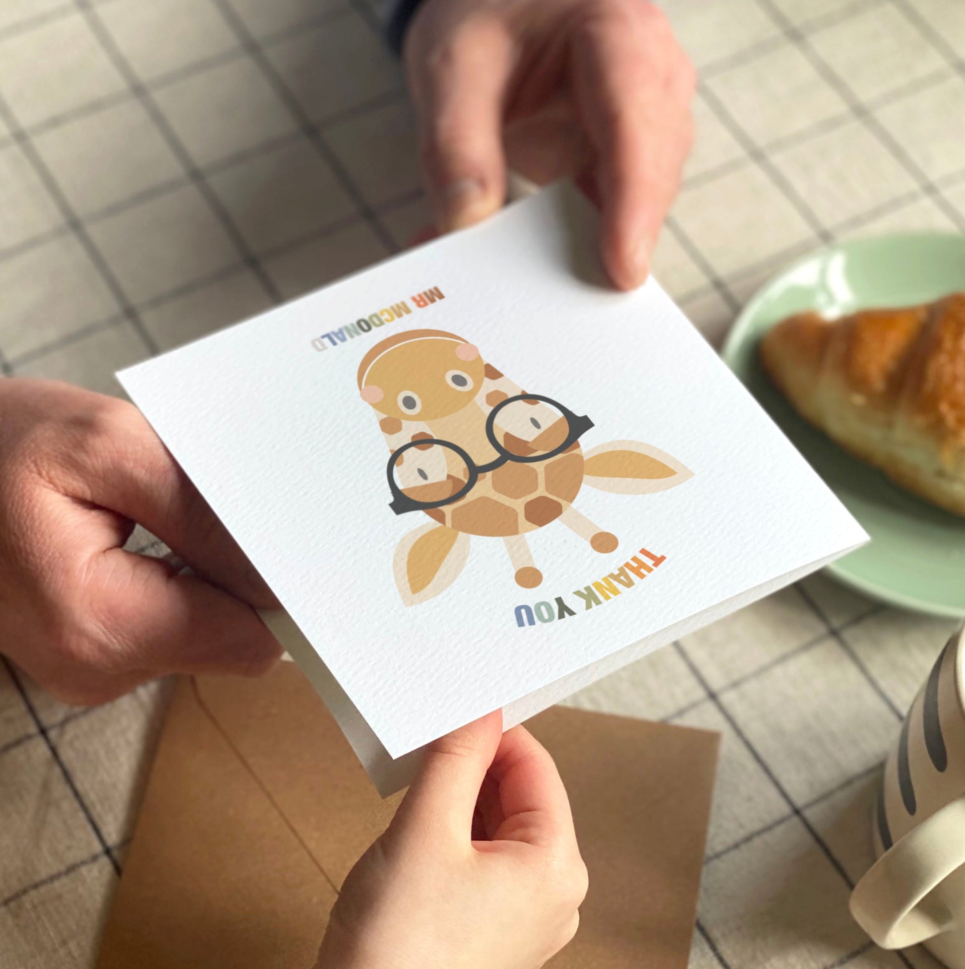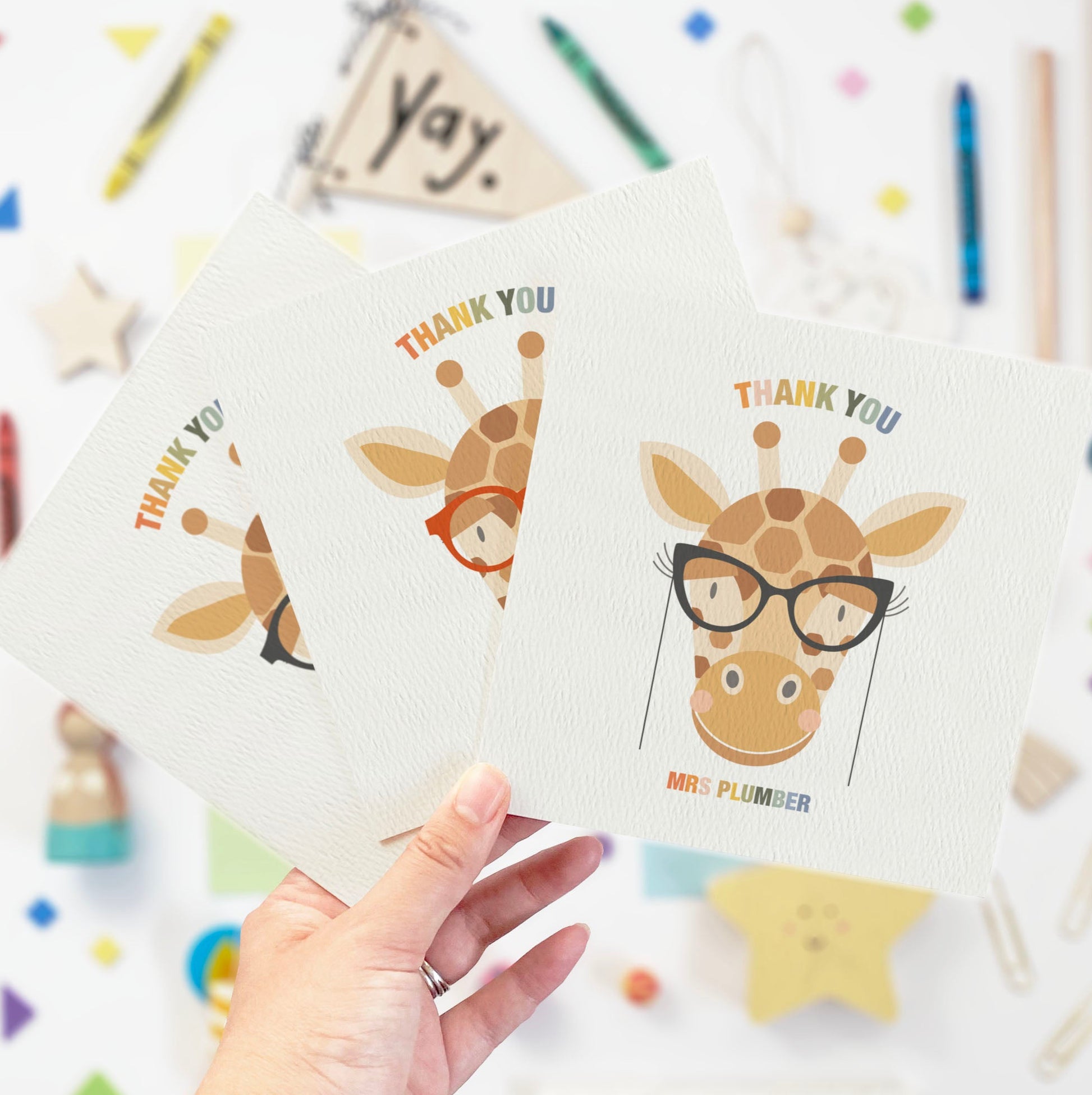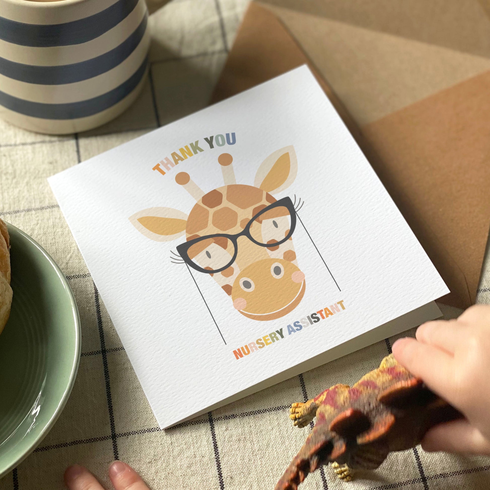 Show your appreciation for your favourite teachers or nursery staff with this delightful Thank You card featuring an adorable giraffe wearing glasses!