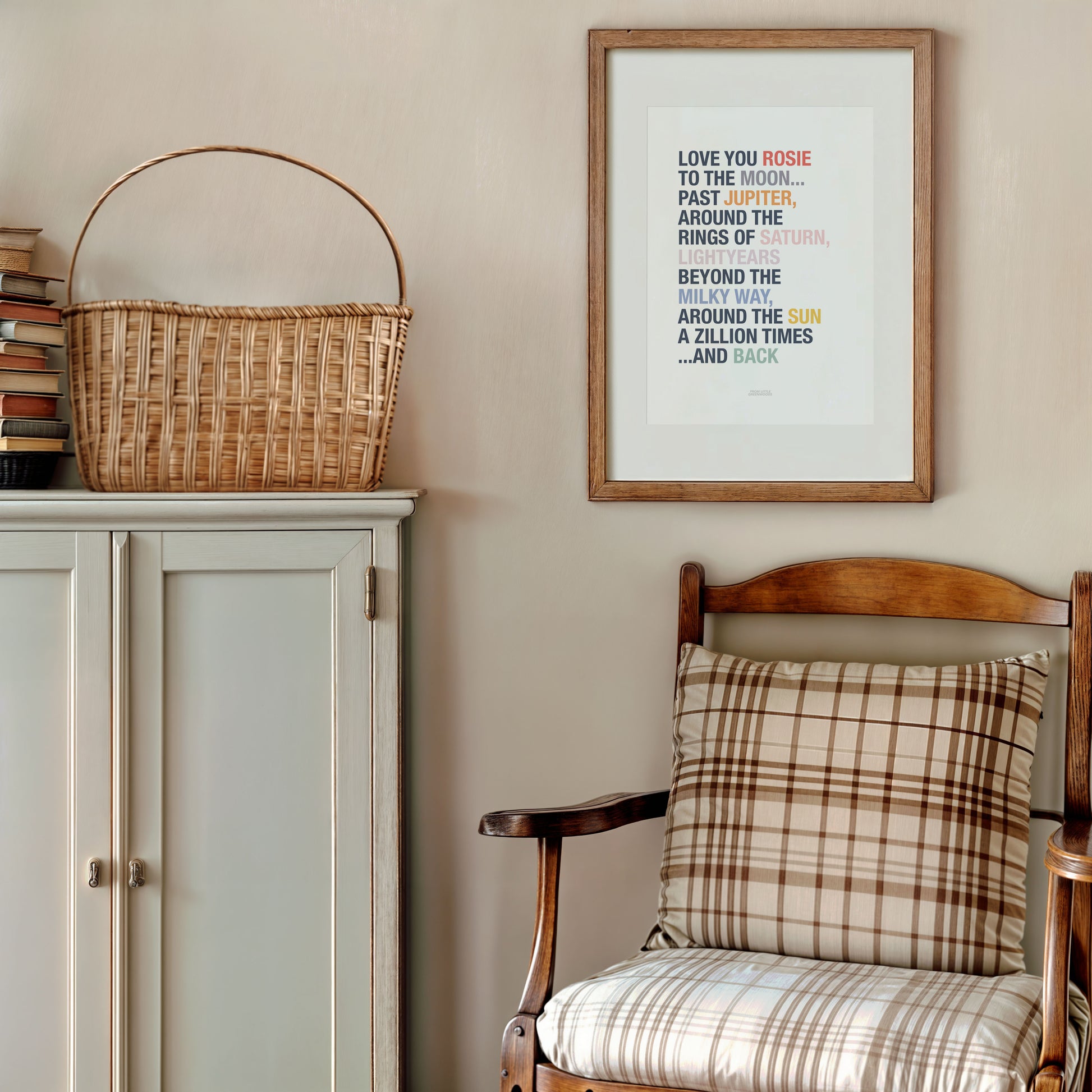 The bold navy with accents of rainbow colours, make this charming quote poster the perfect addition to a newborn's colourful nursery or child's space themed bedroom.