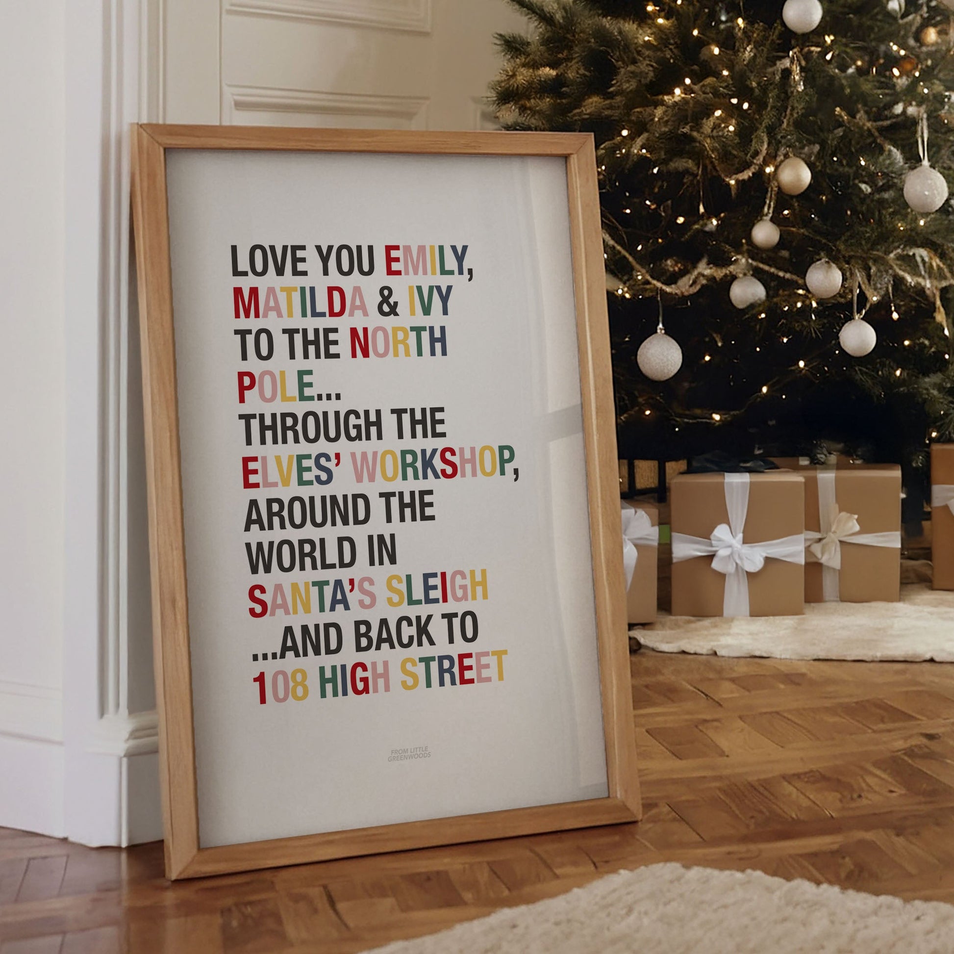 Make this Christmas truly magical with our personalised children’s Christmas quote print, a playful and festive twist on the well loved saying. Instead of 'Love You to the Moon', this charming print reads 'Love You to the North Pole and Back', capturing the magic, excitement and love of the season.