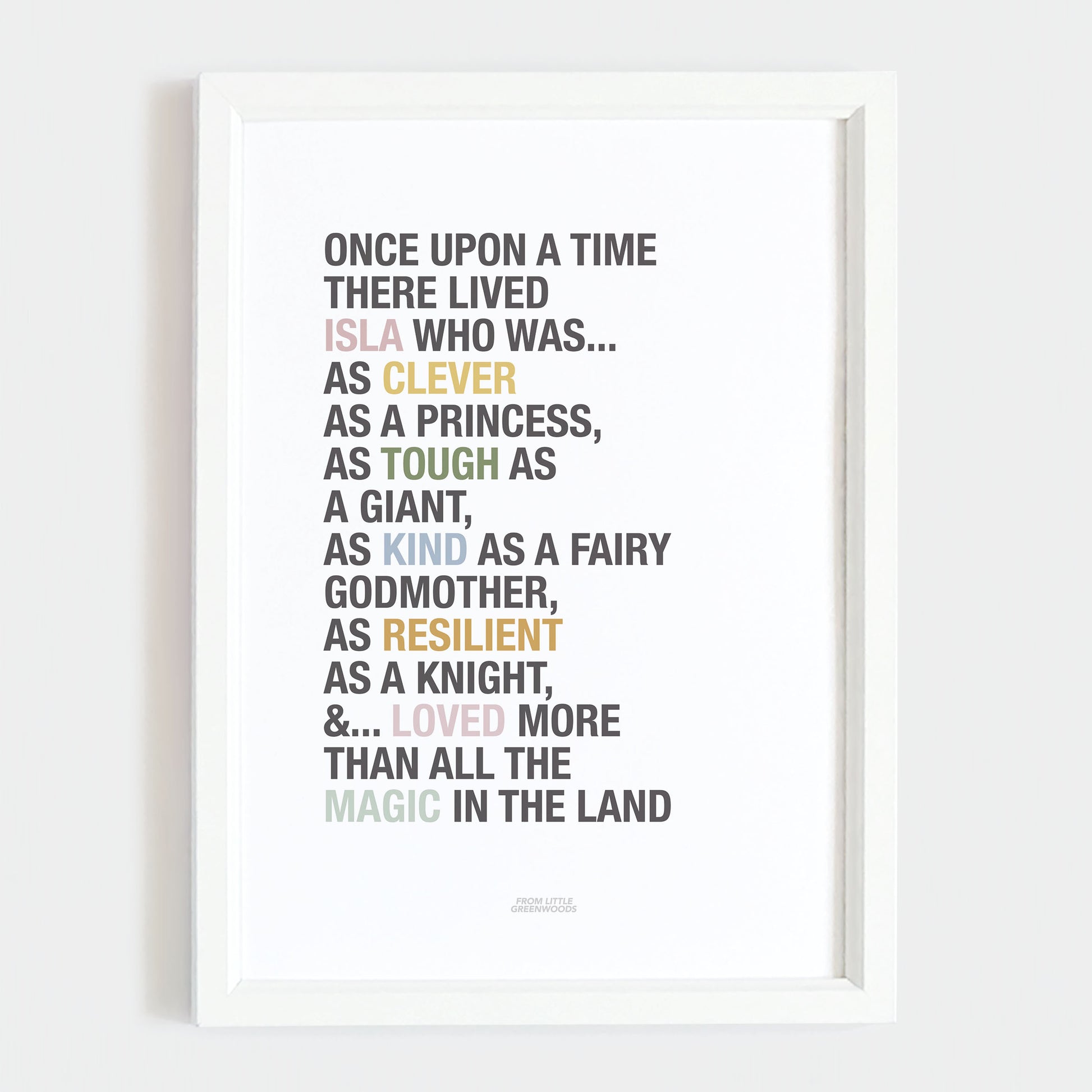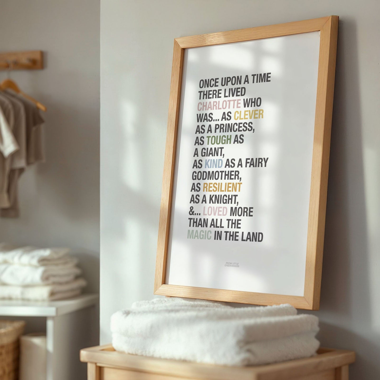 Ensure your little one knows just how loved they are with this positive fairytale inspired Once Upon a Time children's wall art. Designed to encourage self belief and ignite their imagination. These empowering affirmations, with a playful princess twist, celebrate your child's uniqueness and strengths.