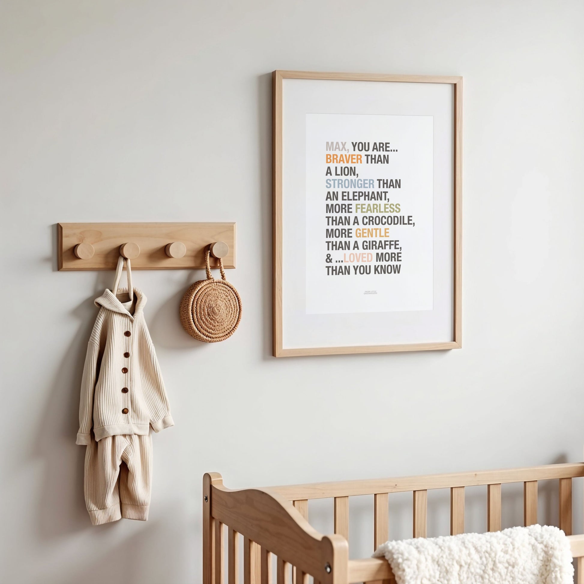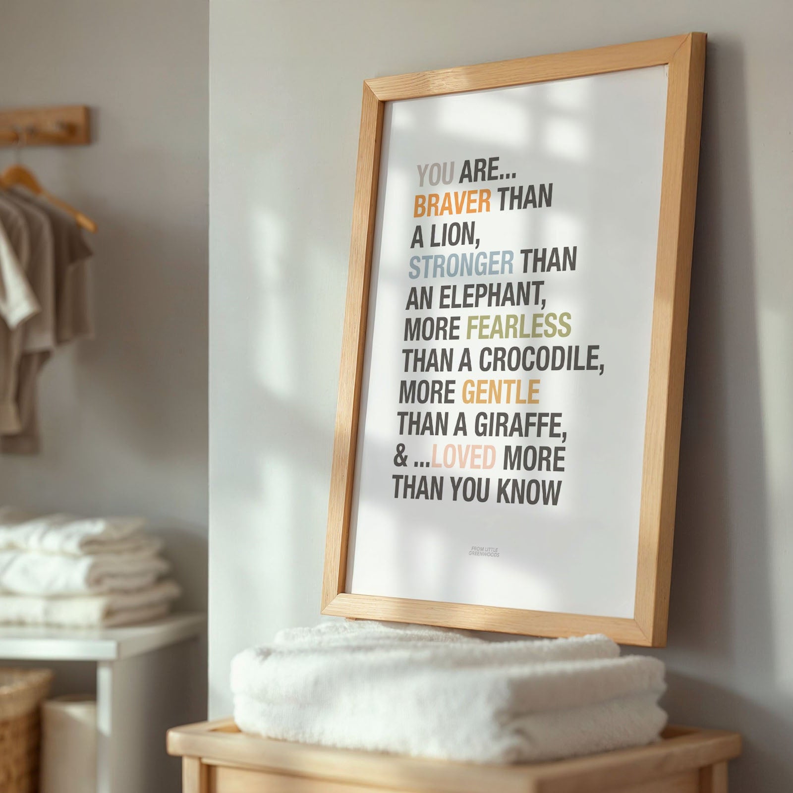 Ensure your little one knows just how loved they are with this positive safari inspired children's wall art. Designed to encourage self belief and ignite their imagination. These empowering affirmations, with a playful animal twist, celebrate your child's uniqueness and strengths.