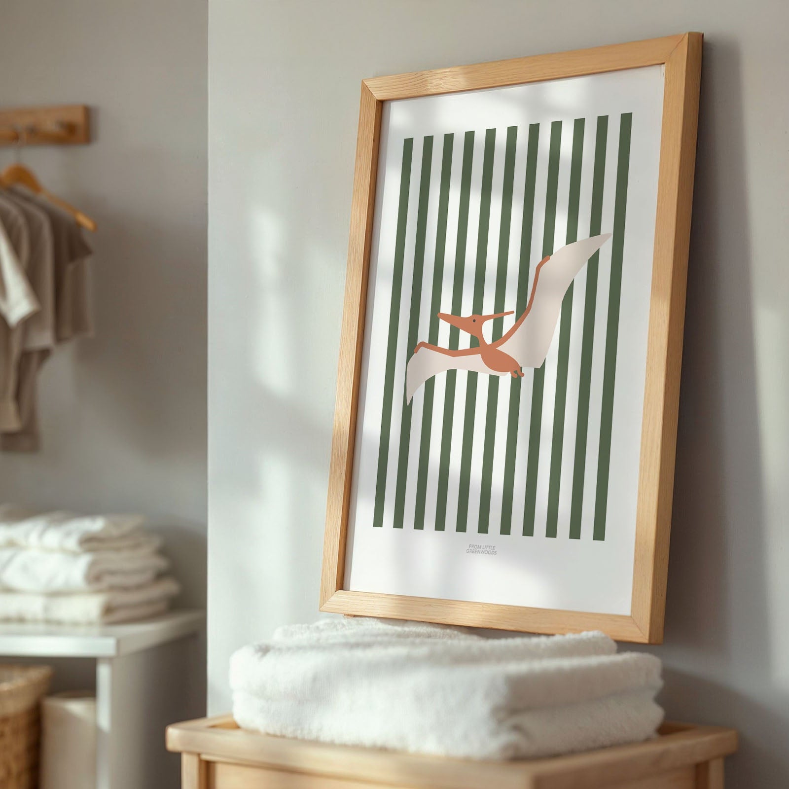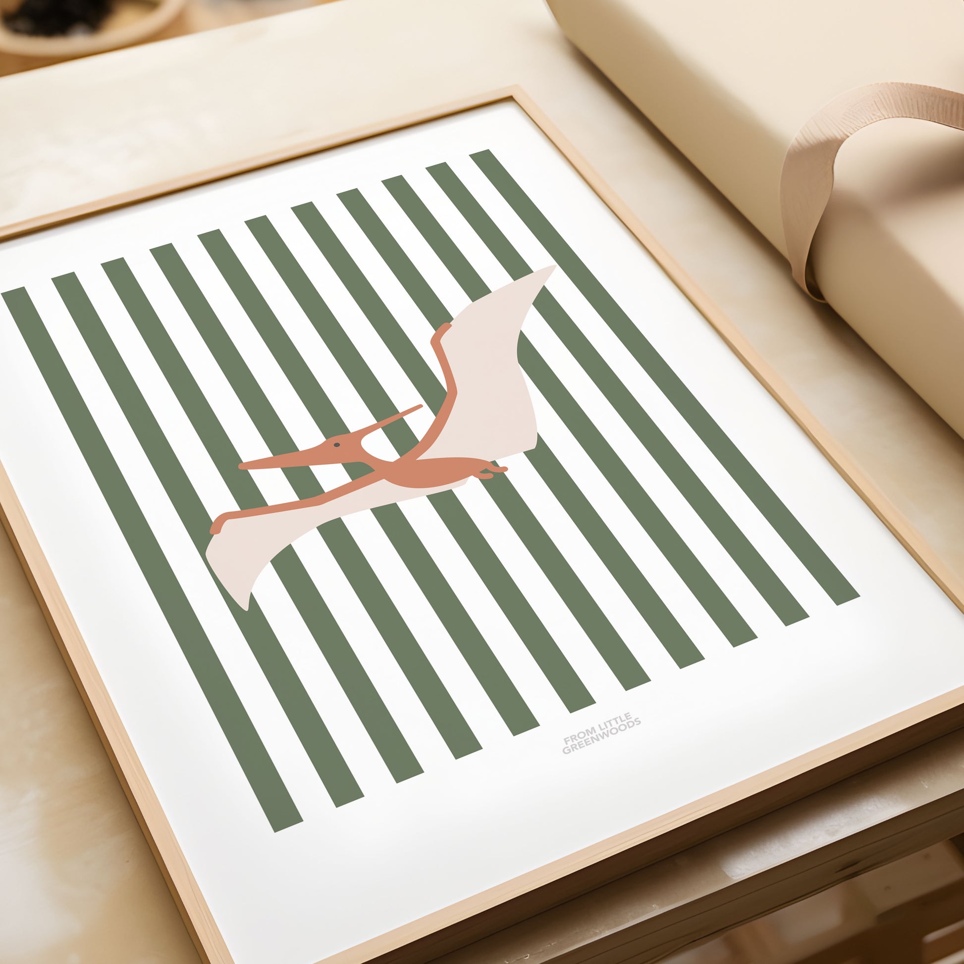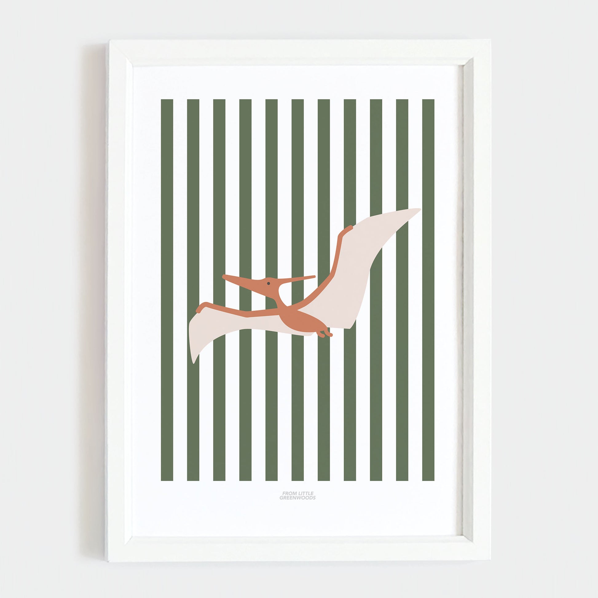 This lovable Pterodactyl illustration on a dark green striped background is the perfect decor for a newborn's colourful nursery or child's dinosaur themed bedroom.