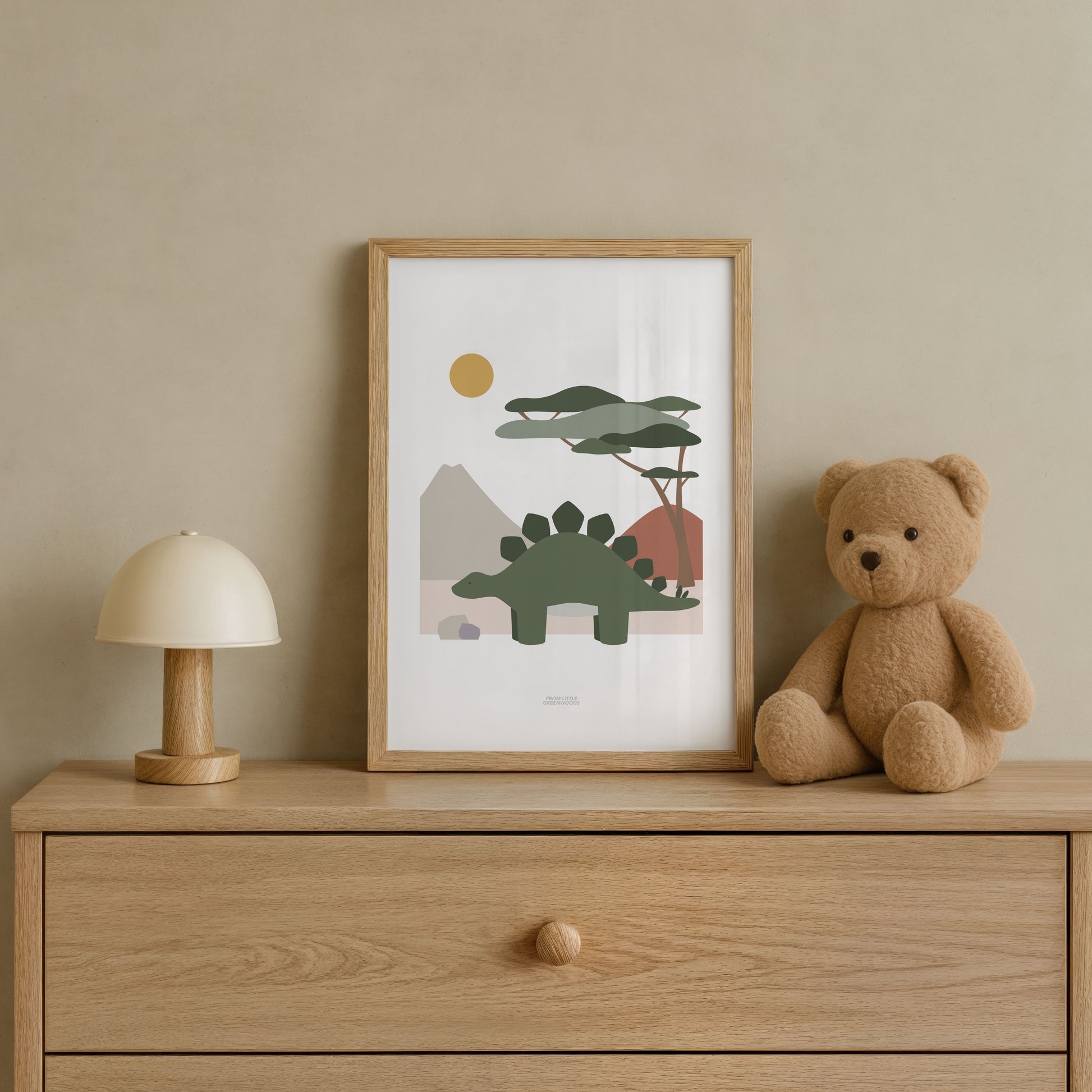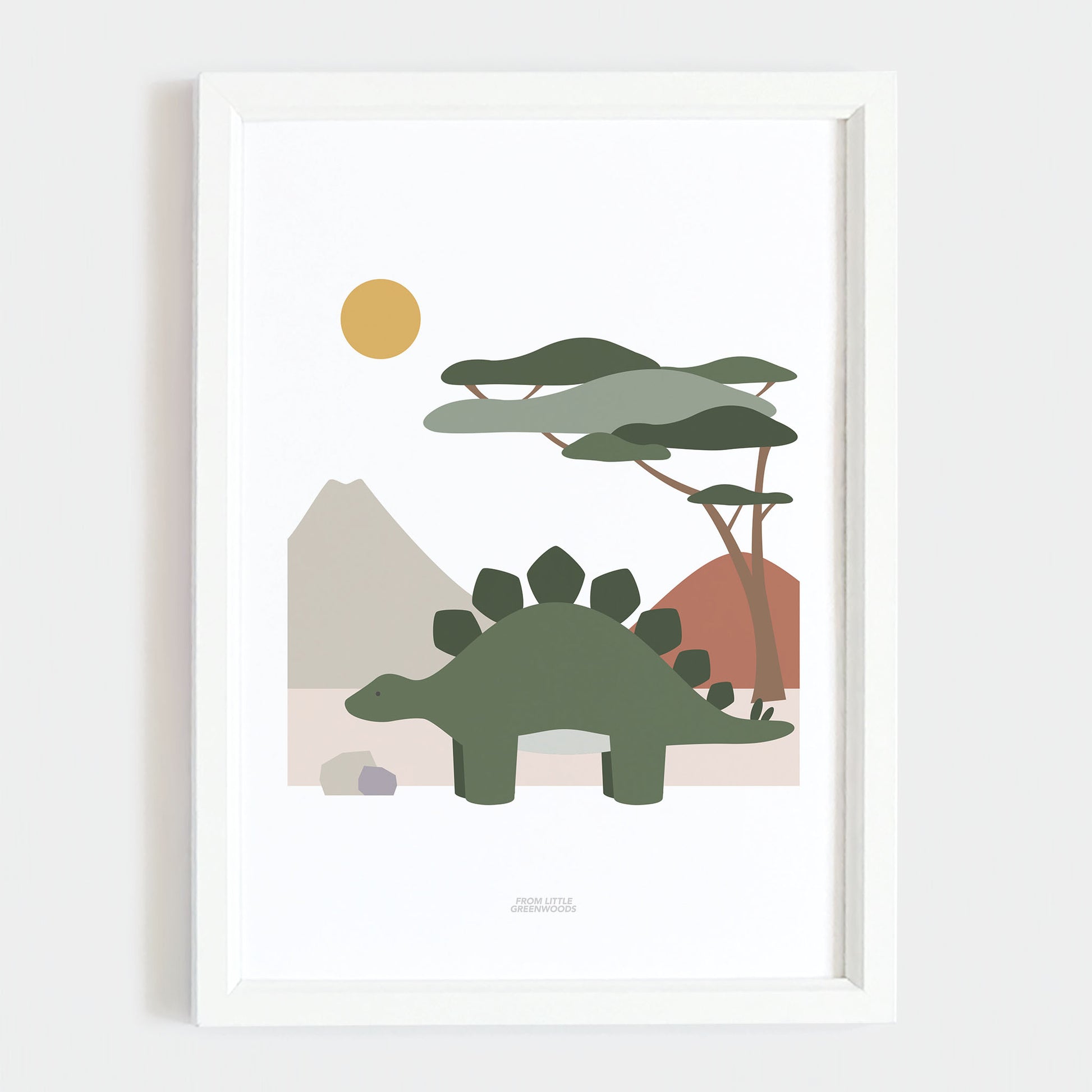 This lovable stegosaurus illustration set in a prehistoric landscape is the perfect decor for a newborn's nursery or child's dinosaur themed bedroom.