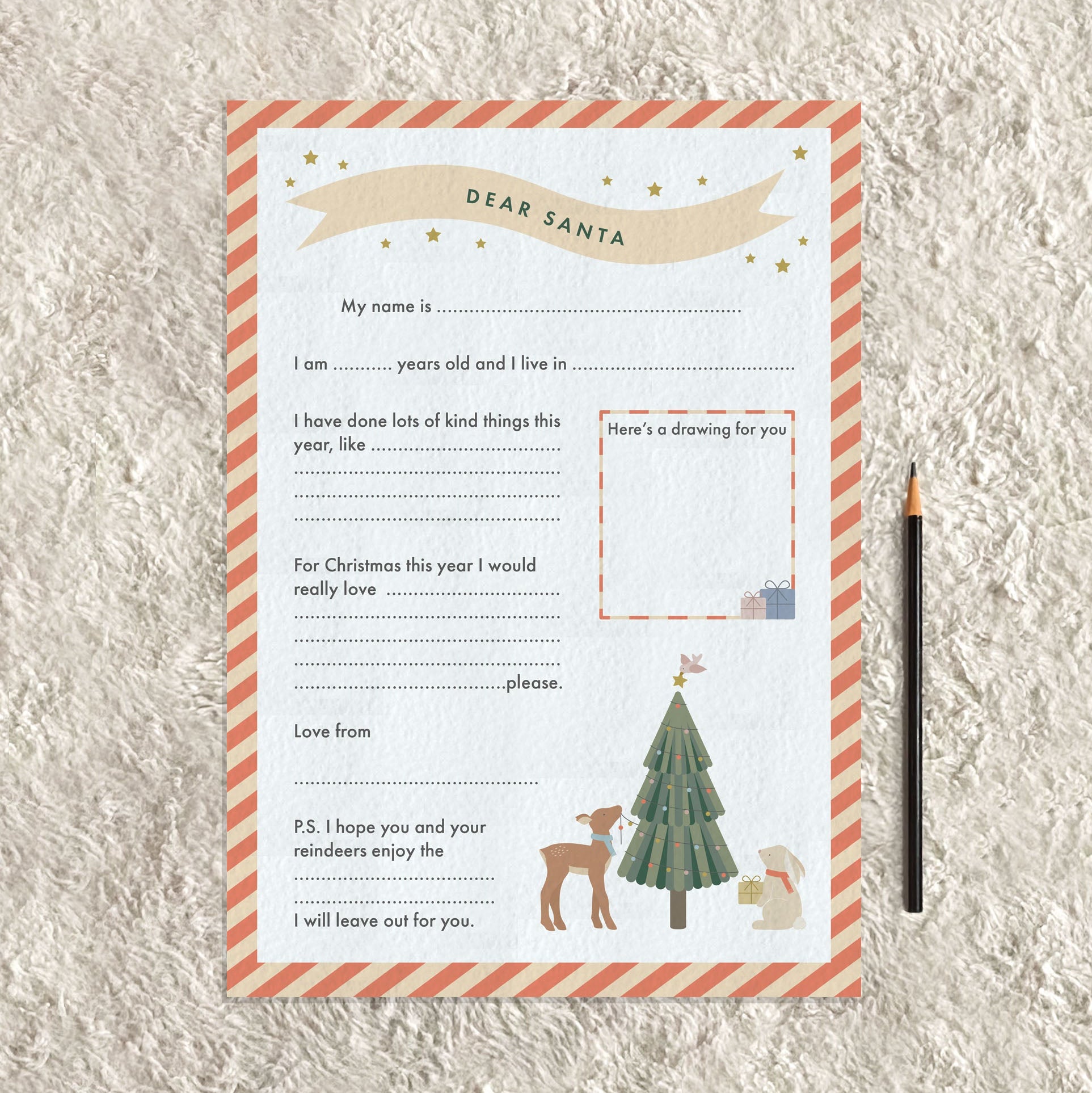 With a beautiful reindeer and winter bunny rabbit gathered around a festive Christmas tree illustration, this Santa letter, printed on luxuriously textured paper, is filled with thoughtful prompts for children to complete, from writing their name and age, to listing the kind things they’ve done this year as well as drawing a special picture just for Santa Claus.
